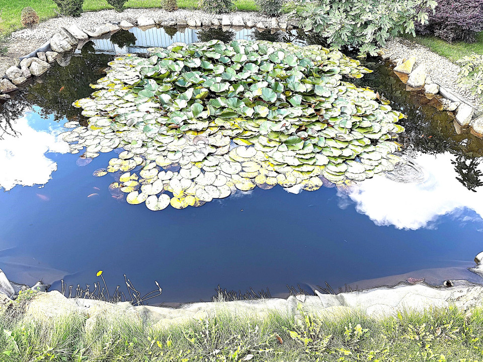 Kerti kialakítás: 700 m² gyönyörű pázsit, kerti tó, 30 méteres utcafront.