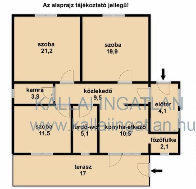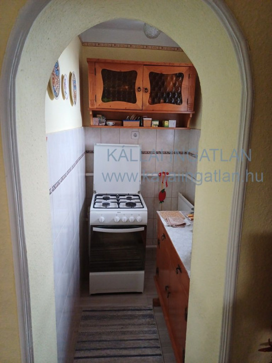 Elosztása: előszoba, közlekedő, főzőfülke, konyha-étkező, kamra, három külön nyíló szoba, fürdő-WC egy helyiségben.