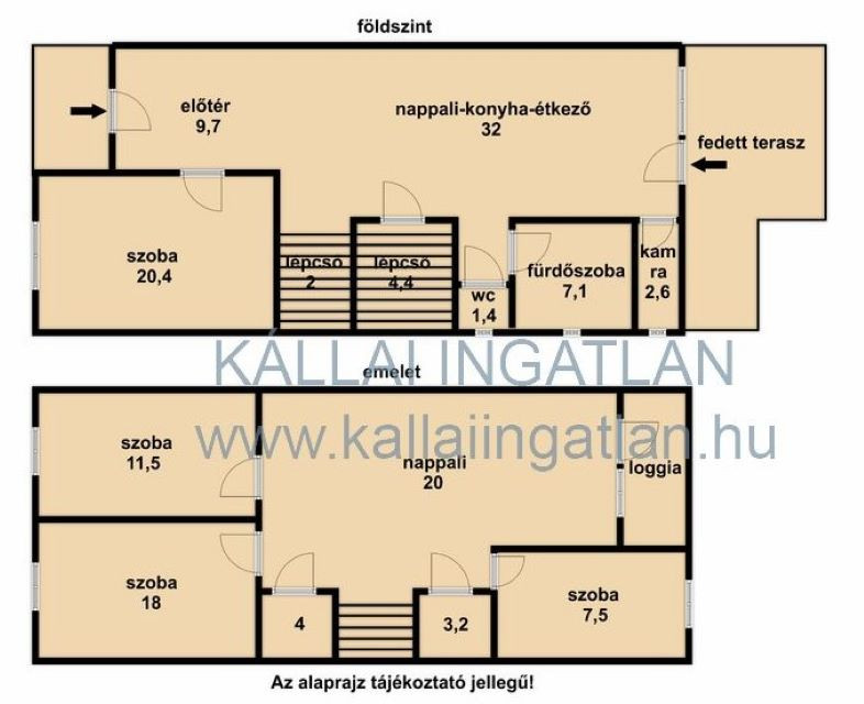 Az alsó szinten előszoba, nappali-konyha-étkező, 1 szoba fürdőszoba, külön WC, kamra és egy 17 nm-s fedett terasz került kialakításra.