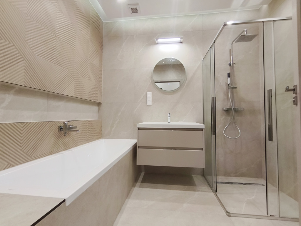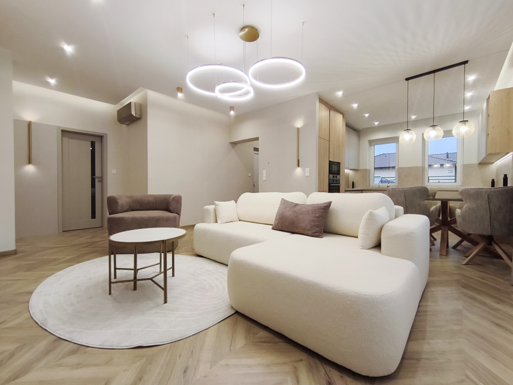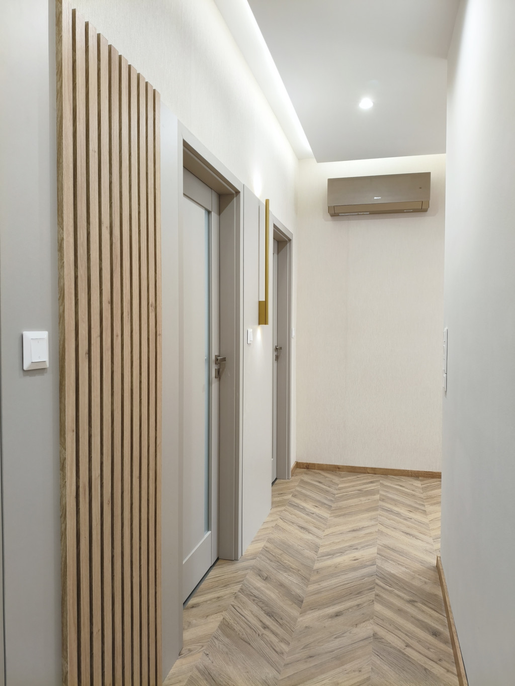A lakás járólap és laminált padló burkolatokkal, hőszivattyús padlófűtéssel, valamint inverteres hűtő-fűtő klímával felszerelt. A 3 rétegű üvegezésű műanyag nyílászárók elektromos alumínium redőnyökkel rendelkeznek, biztosítva az energiahatékonyságot és a kényelmet.