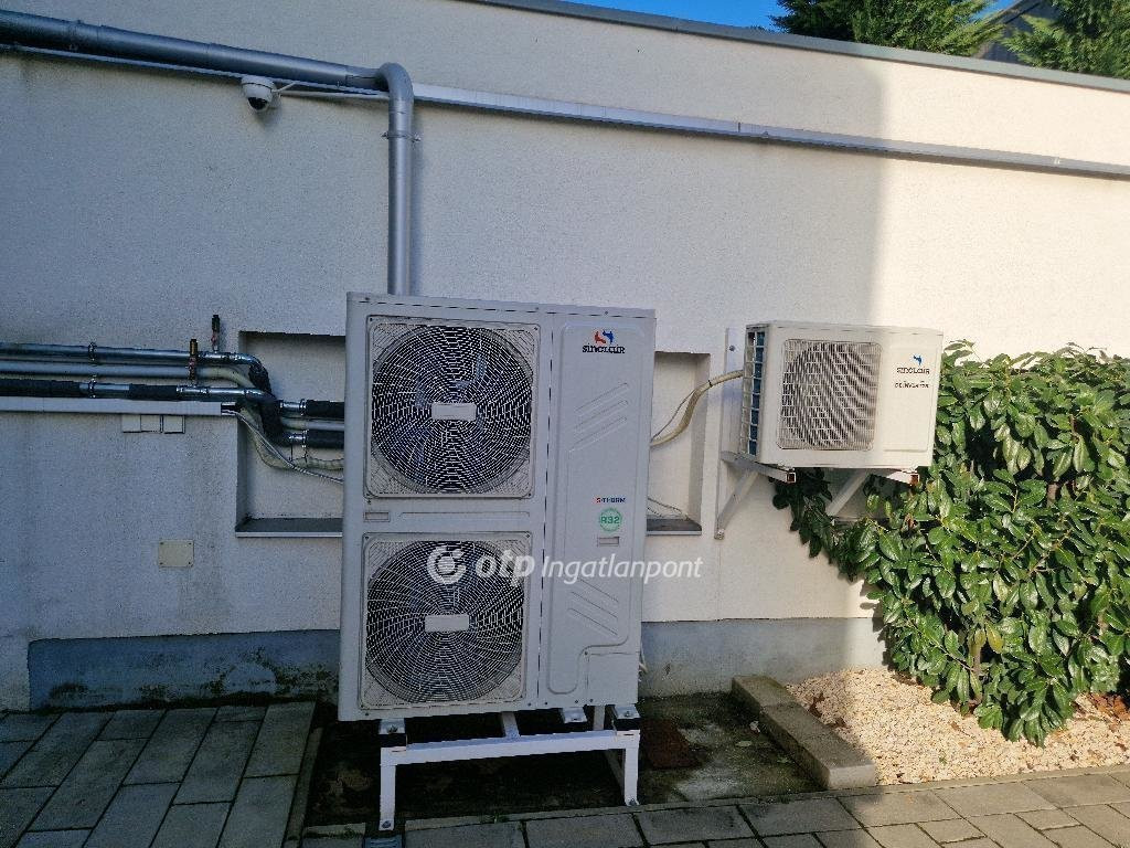Modern hőszivattyús hűtő-fűtő rendszer, padlófűtés és klímaberendezés, teljes körű kamerarendszer.