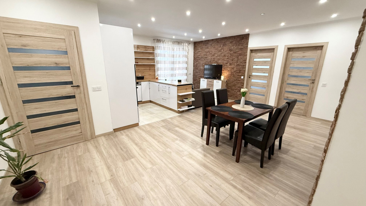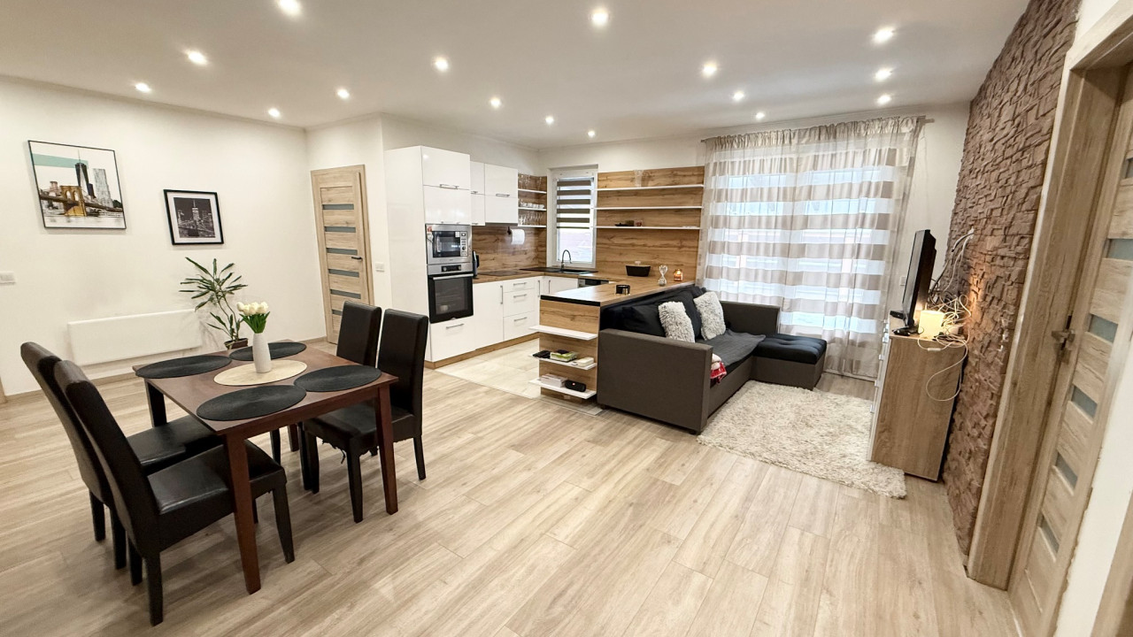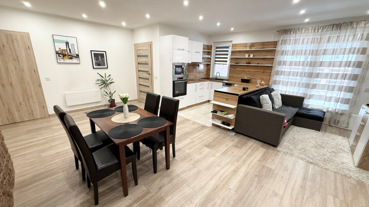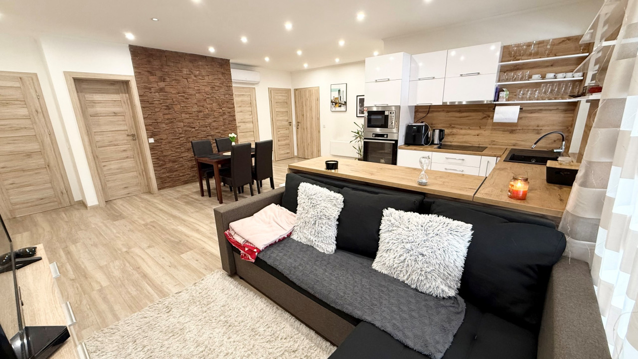 Elosztása: 2 külön nyíló szoba, tágas amerikai konyha étkezős nappali, egy légtérben.