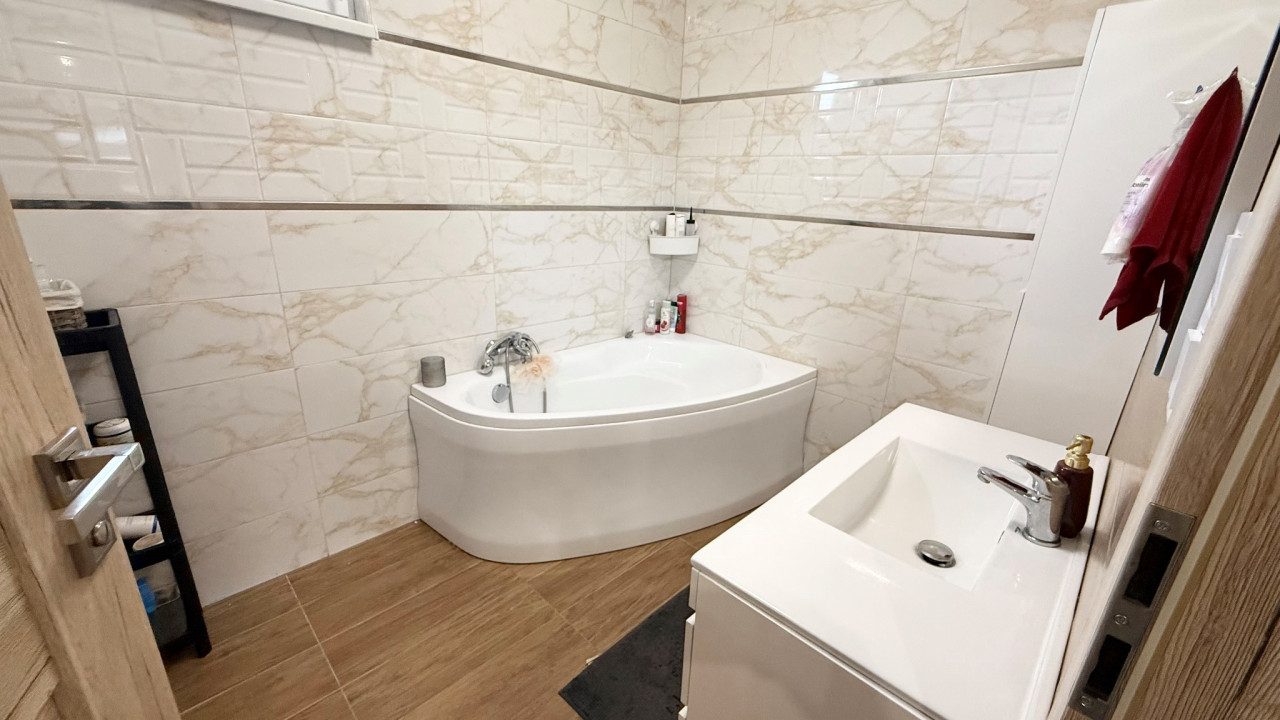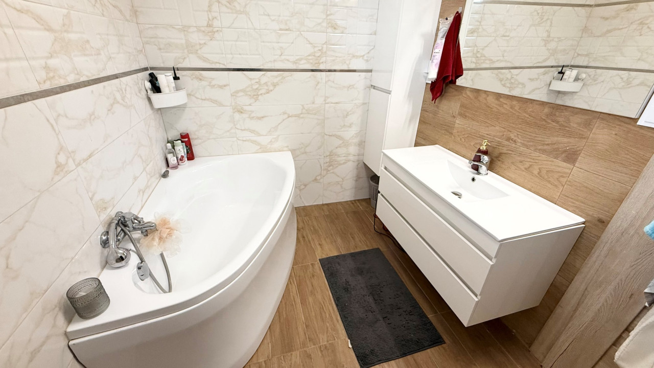 Tágas sarokkádas fürdőszoba, külön wc.