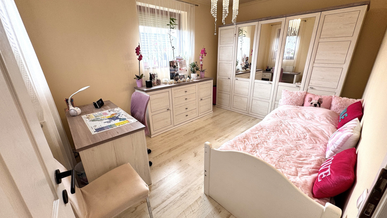 Emelet: 2 külön nyíló hálószoba, gardrób, fürdőszoba wc-vel.