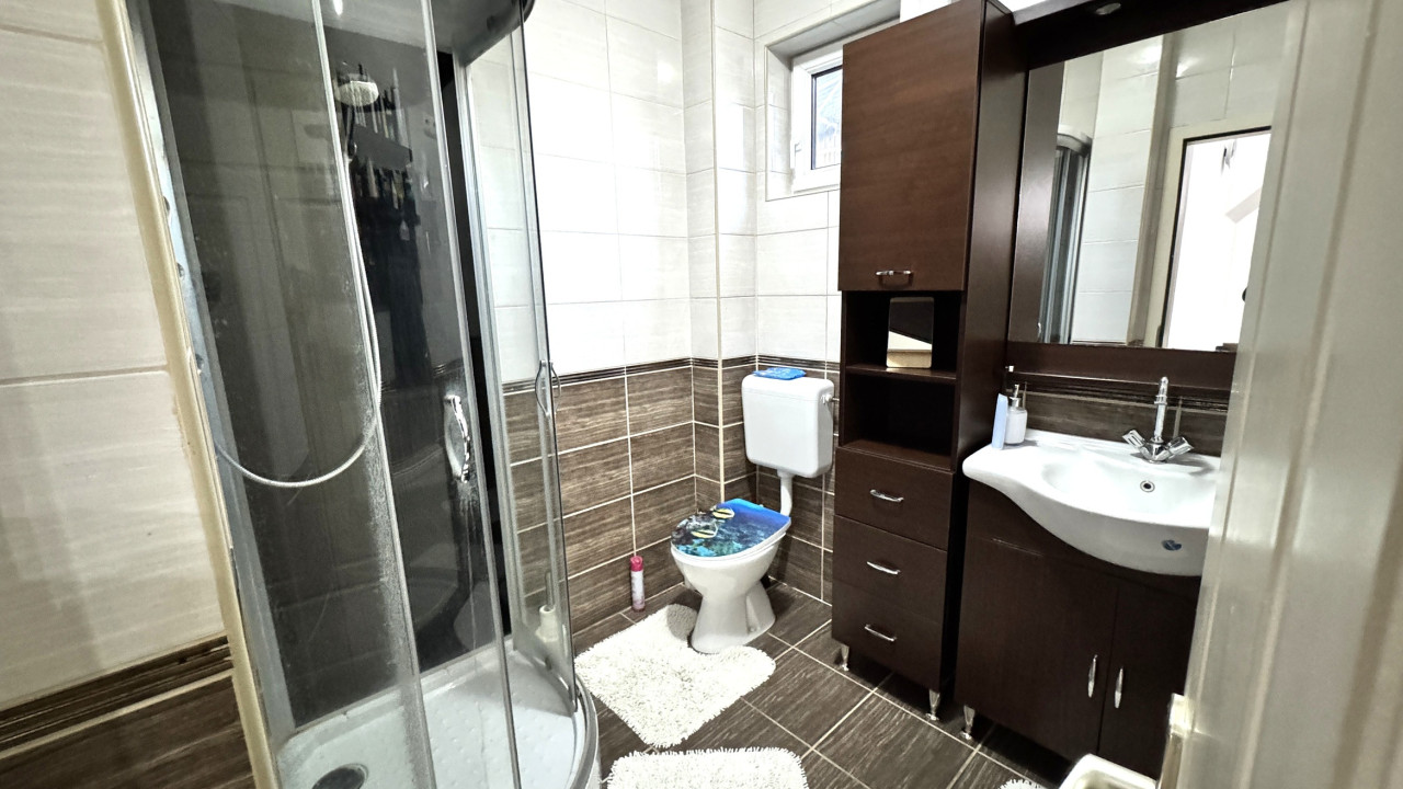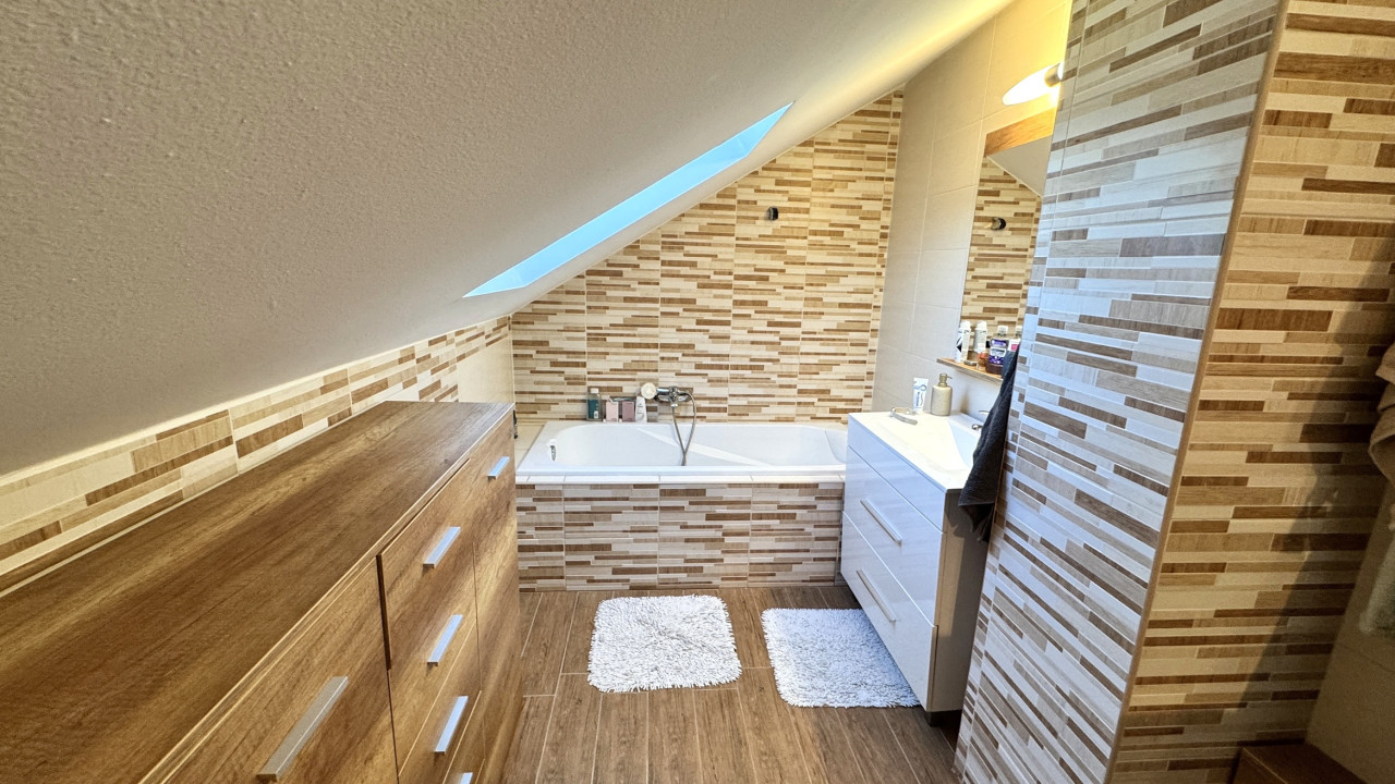 A felső szinten: lépcsőház, közlekedő, 3 külön nyíló hálószoba, fürdőszoba-wc-mosókonyha egyben.