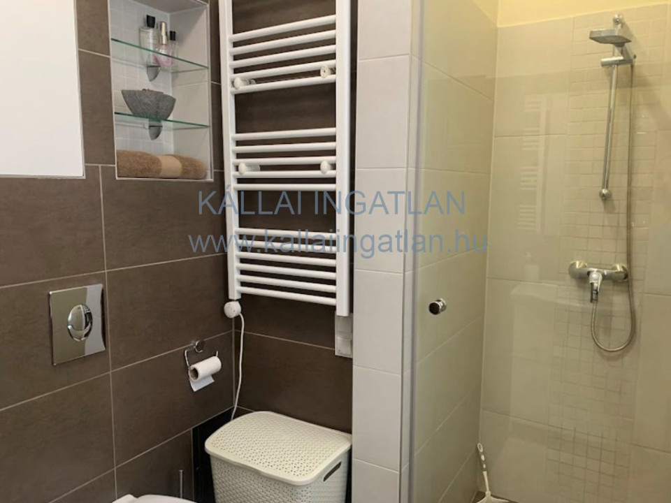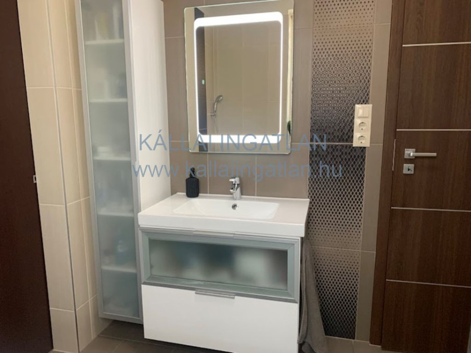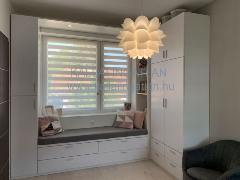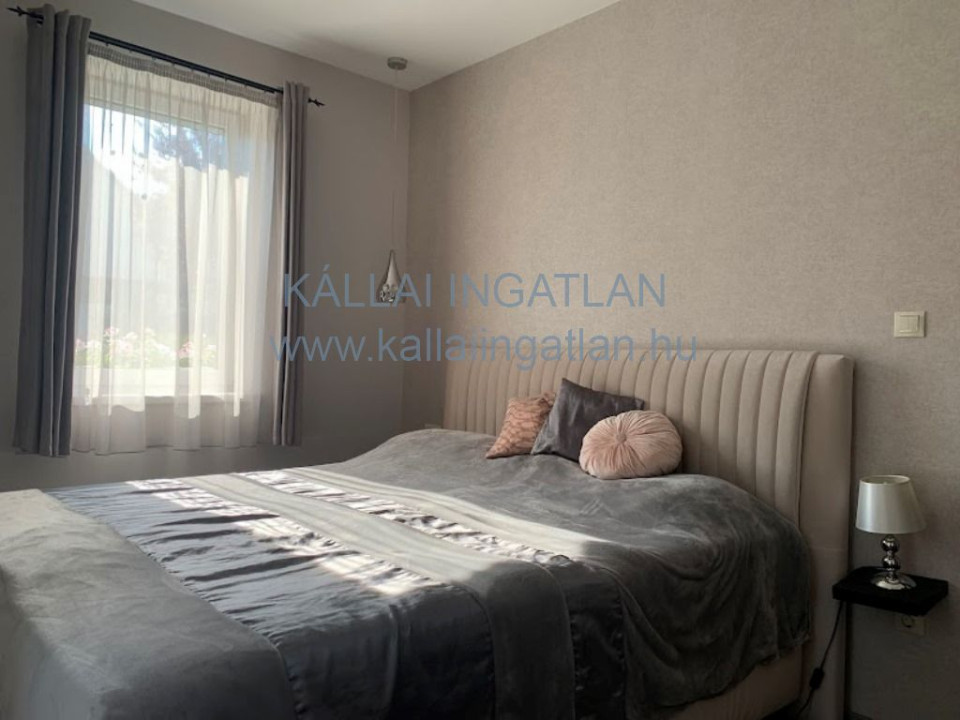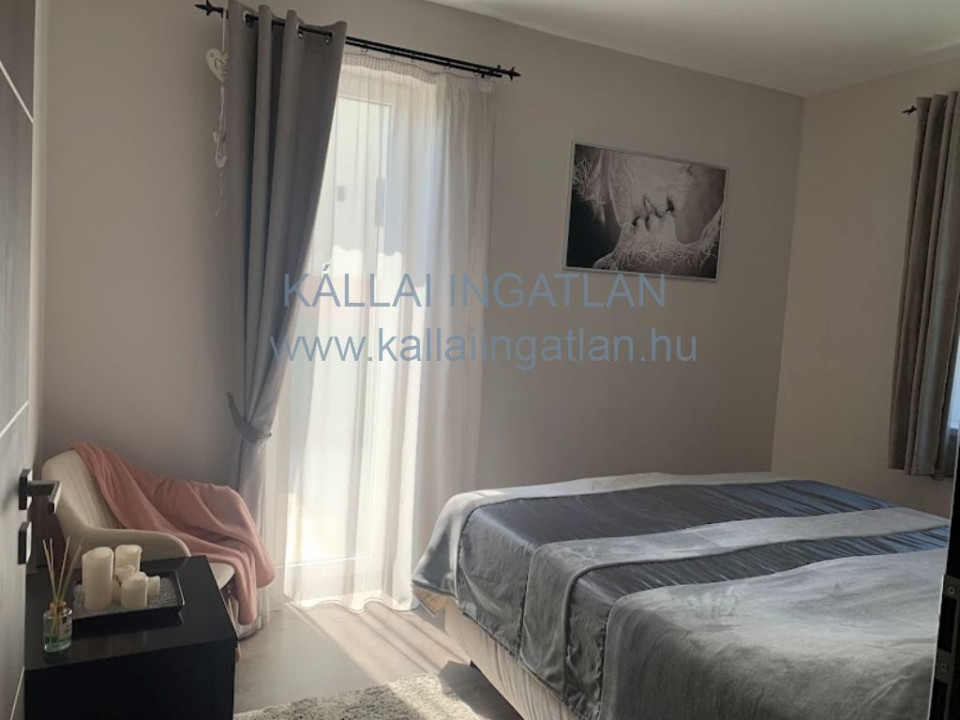 Az alsó szinttől leválasztható emeleti részhez a nappaliból induló elegáns lebegőlépcső vezet fel. Ezen a szinten kialakításra került egy kis nappali rész, 3 napfényes külön nyíló szoba, épített zuhanyzós fürdőszoba WC-vel és egy hűtő-fűtő klíma került beépítésre.