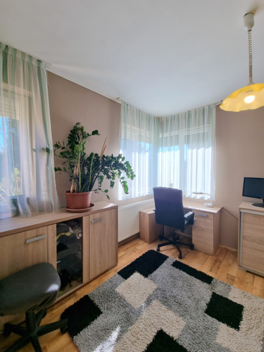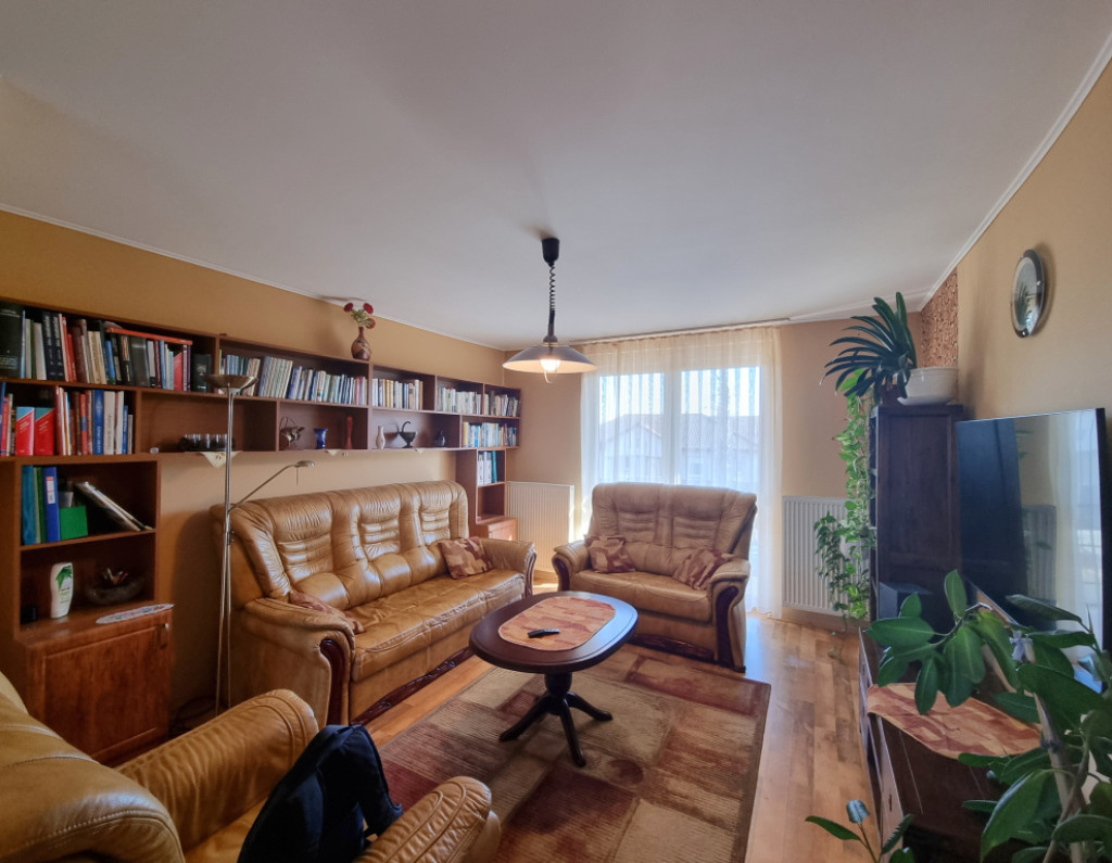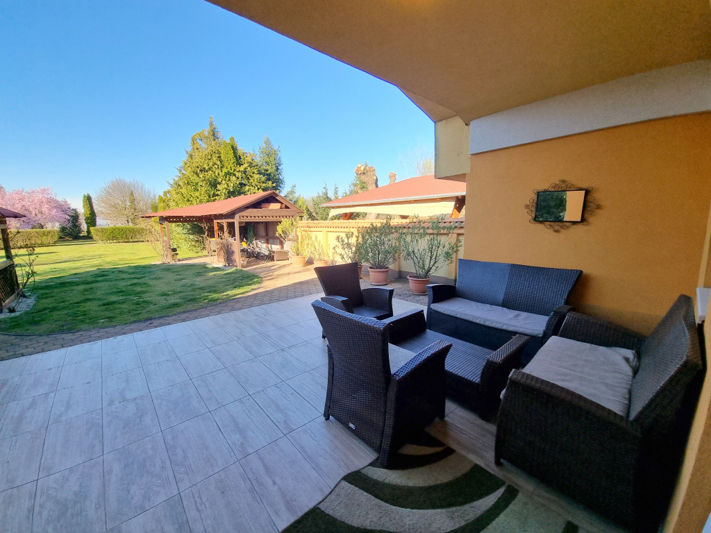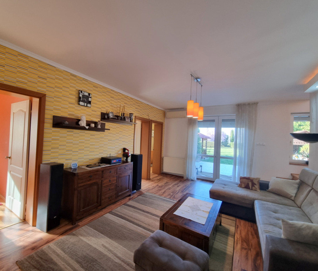 Az előszobából hangulatos, meleg, otthonos színekkel bíró nappalin keresztül érünk a jó ízléssel, minőségi anyagokból épült konyhába, mellett 3 napfényes hálóval, tágas nappalival, vidám, színes és tágas fürdőszobával. A nappaliból kilépve a fedett teraszra, elénk tárul a parkosított, automata öntözőrendszerrel is ellátott gyönyörű kert. A nappaliból a tömörfa masszív lépcsőn egy másik erkélyes nappaliba érünk, ami akár vendégszobaként is funkcionálhat, mivel mellette még egy kisebb zuhanyzós fürdőszoba található.
