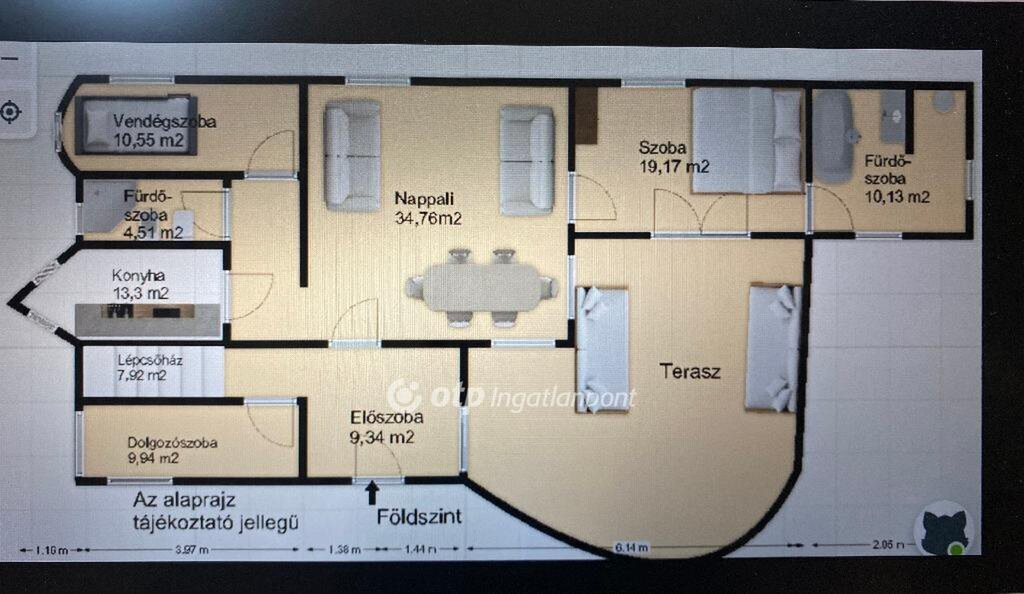 - Földszint: nappali, konyha, étkező, hálószoba saját fürdővel, vendégszoba, dolgozószoba, további fürdő