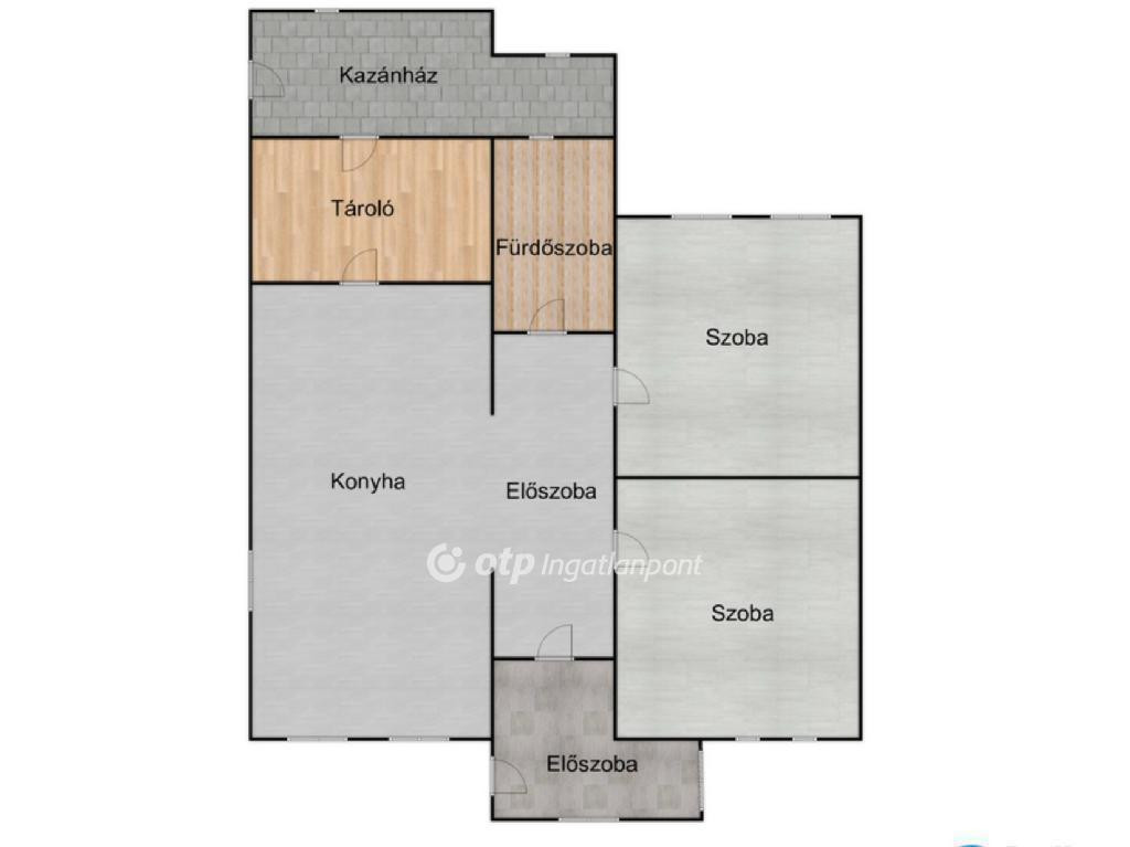 Ingatlan elosztása:előkert, 2 beállós garázs, hálószoba, gyerekszoba, konyha étkezővel, fürdőszoba WC-vel, tároló, kazánház hátsókert.