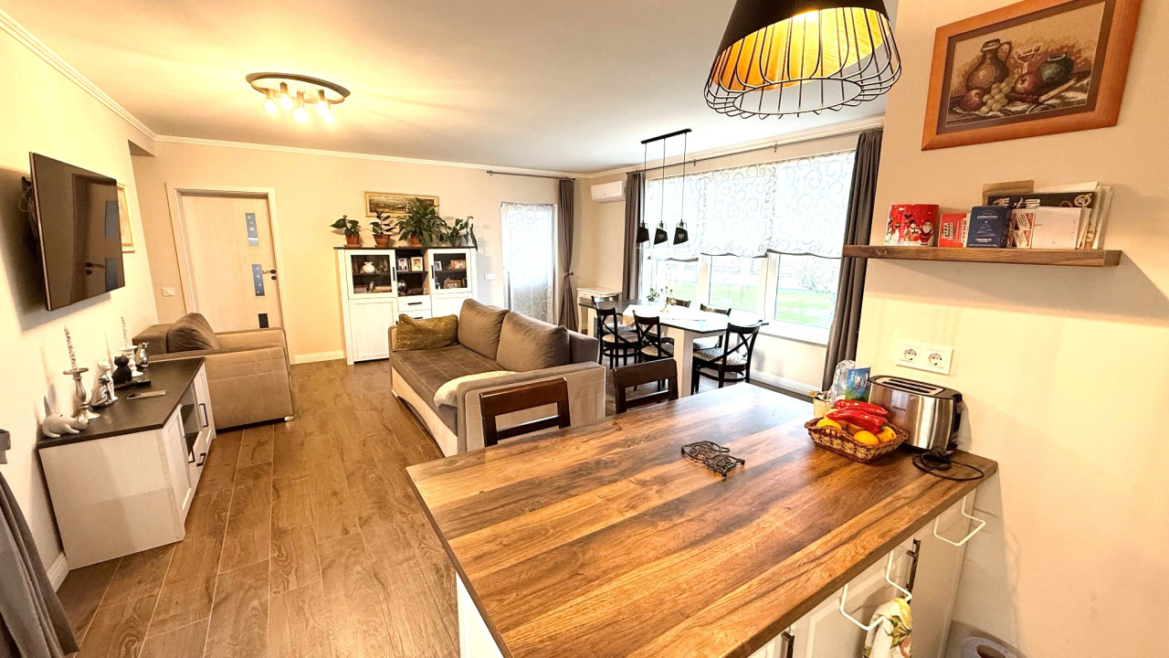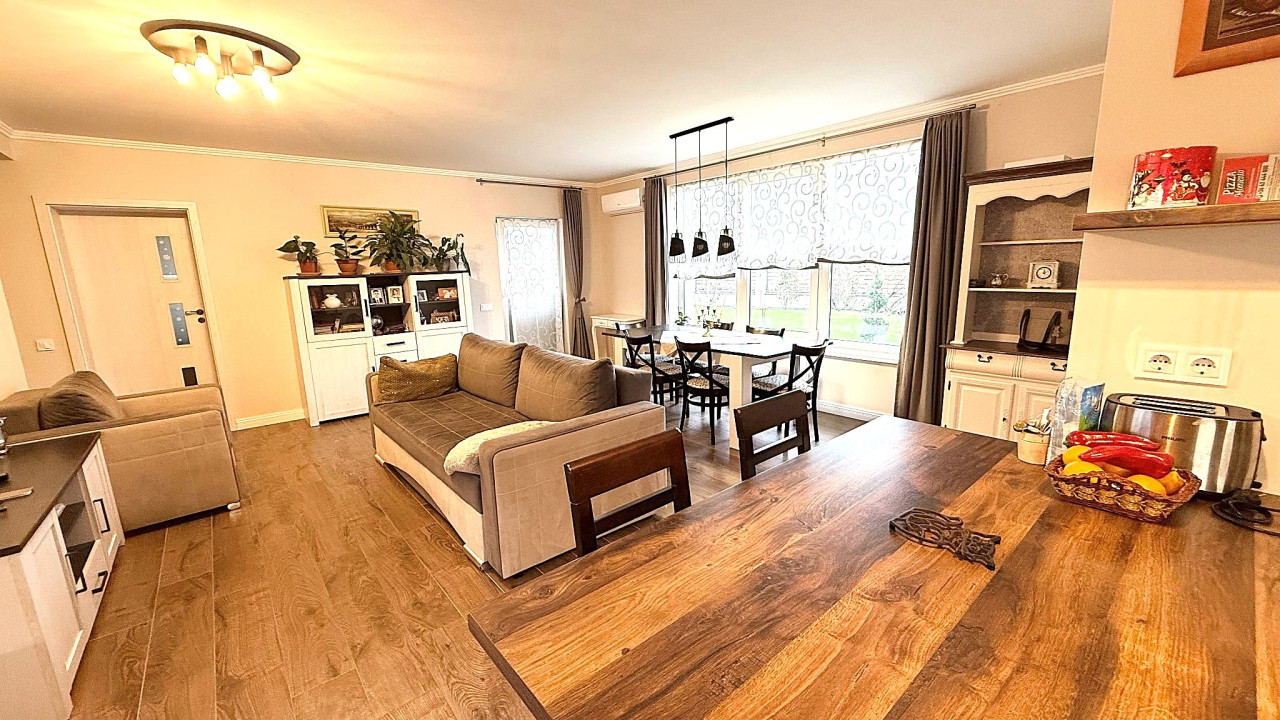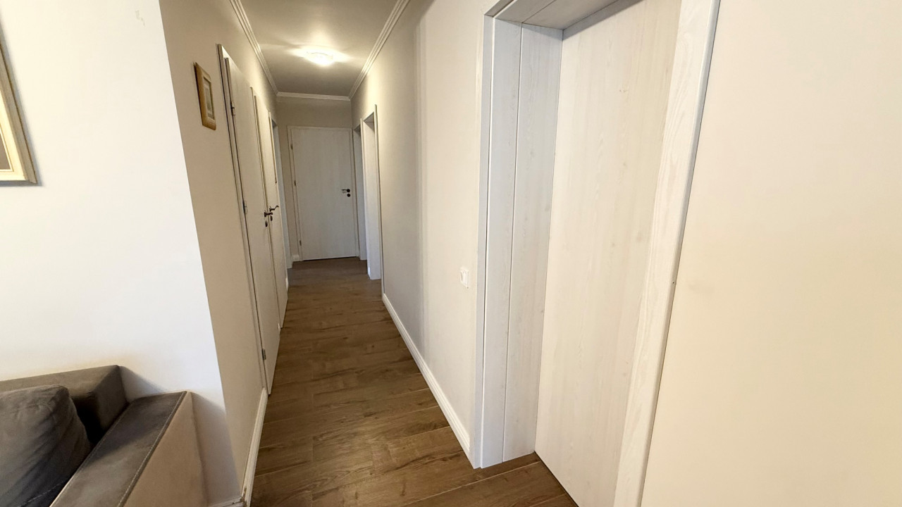 Elosztása: előszoba, amerikai konyha-nappali egy légtérben, 3 külön nyíló hálószoba, zuhanyzós fürdőszoba, gardrób, mosókonyha, külön wc.