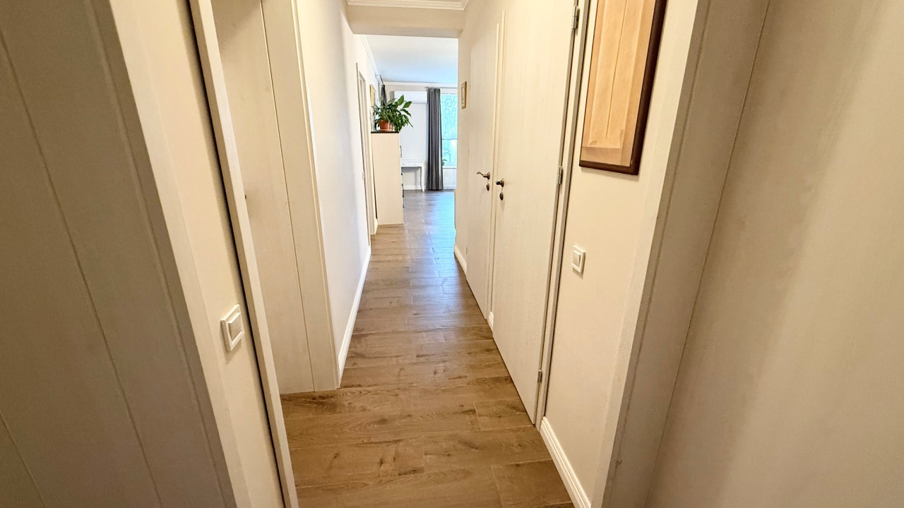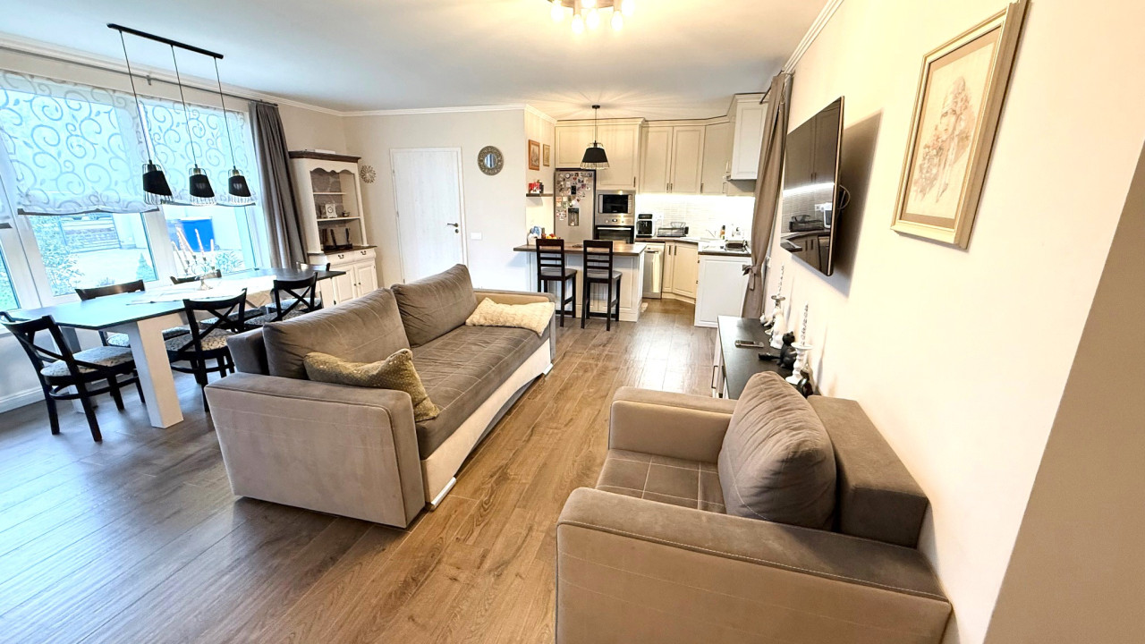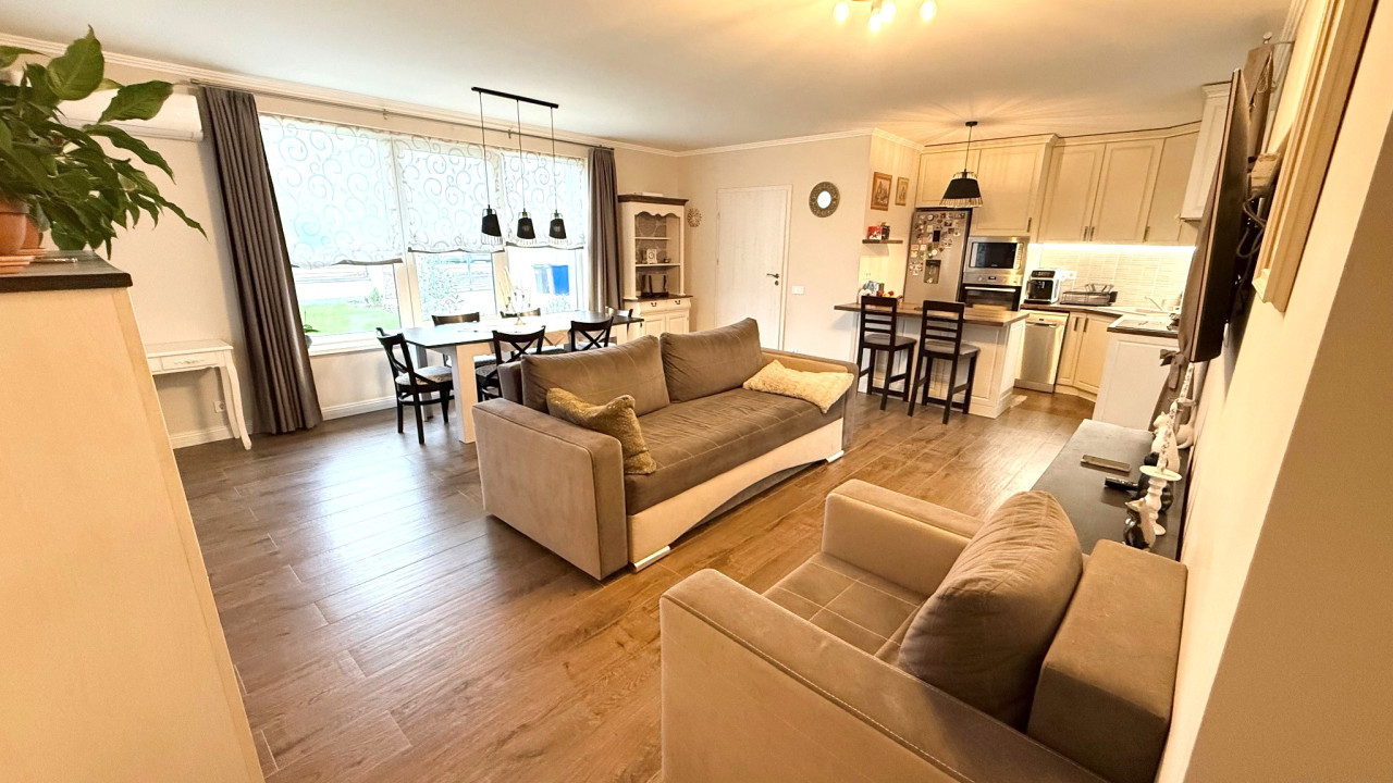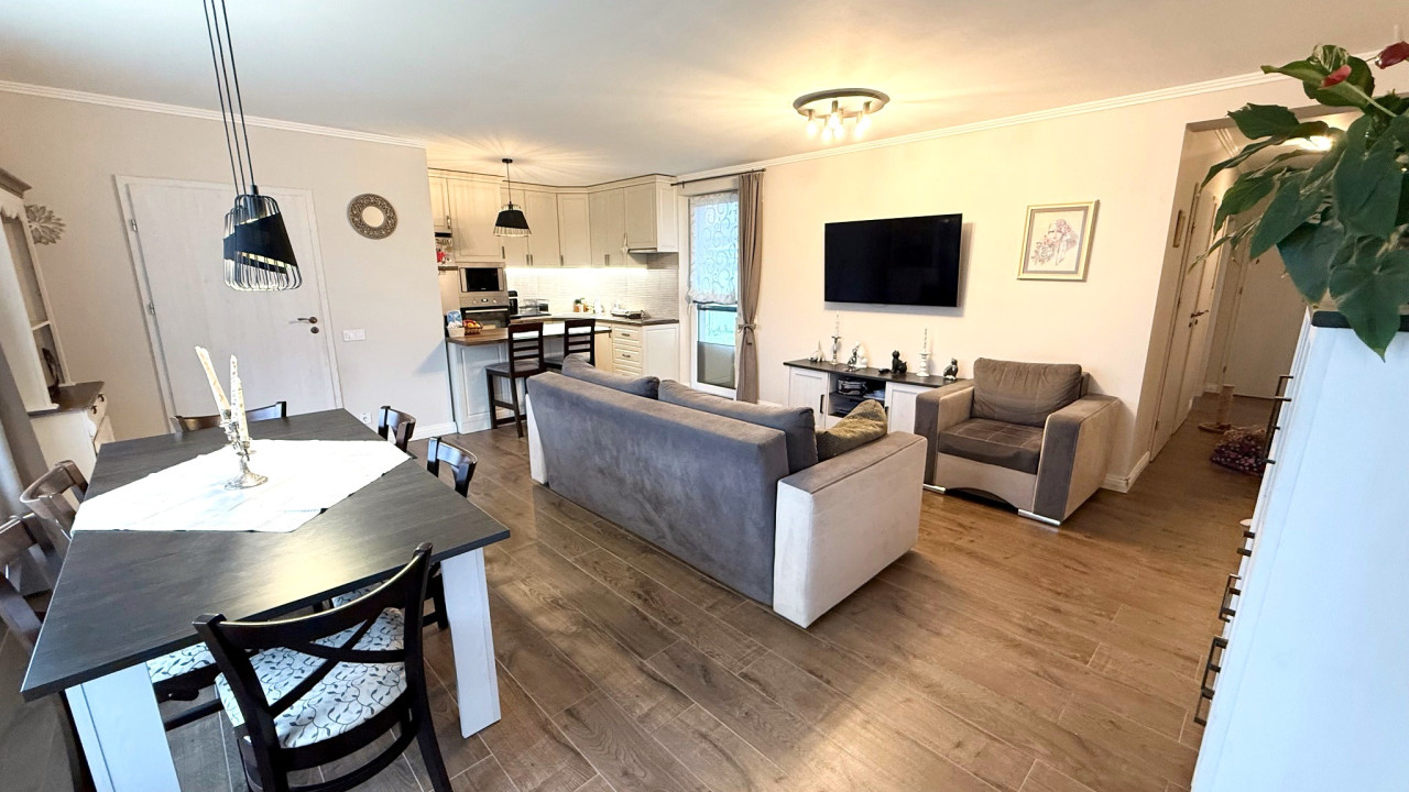 Elosztása: előszoba, amerikai konyha-nappali egy légtérben, 3 külön nyíló hálószoba, zuhanyzós fürdőszoba, gardrób, mosókonyha, külön wc.