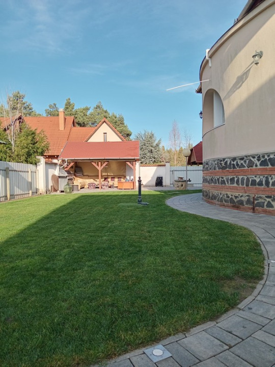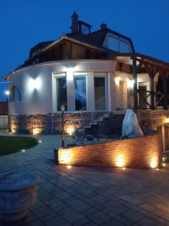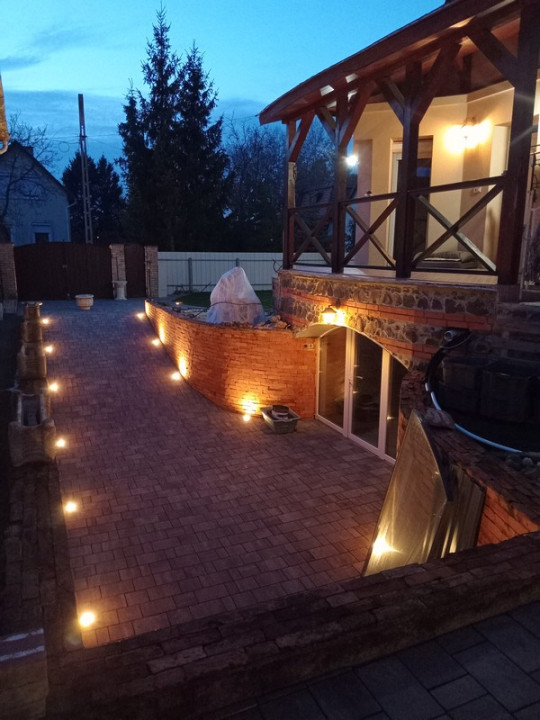 A gyönyörűen kialakított udvar igazi ékkő: füvesített terület, térkőburkolat, melynek kövei közé számos hangulatvilágítás került beépítésre, így az esti órákban is különleges atmoszférát nyújt. Az udvaron filagória, valamint szalonnasütő is helyet kapott, ideális baráti és családi összejövetelekhez.