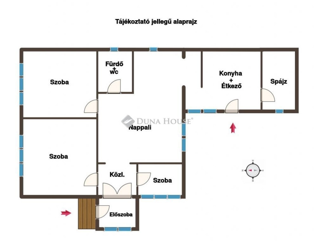 - Nyílászárók: műanyag hőszigetelt ablakok redőnnyel, műanyag biztonsági bejárati ajtó, fa beltéri ajtók.