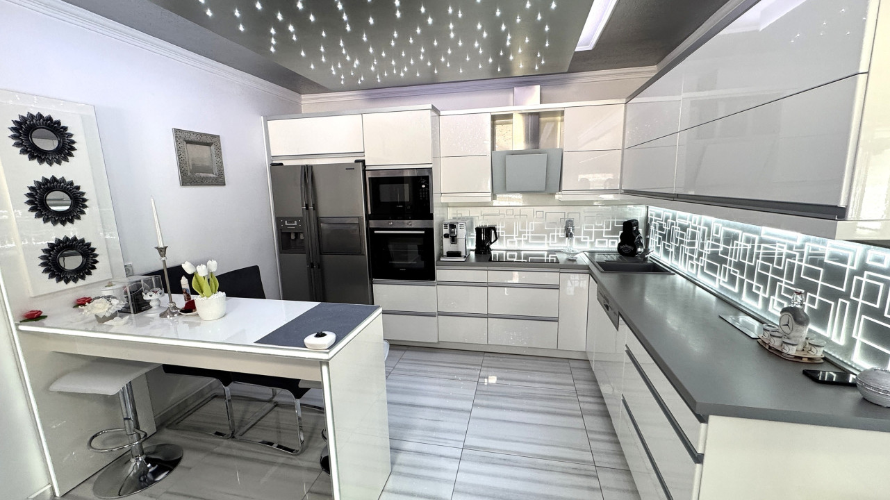 Riasztó, kamera rendszer, automata garázskapu, automata kapu, elektromos autó töltő, led fényforrások, öntözőrendszer, beépített, gépesített konyha.