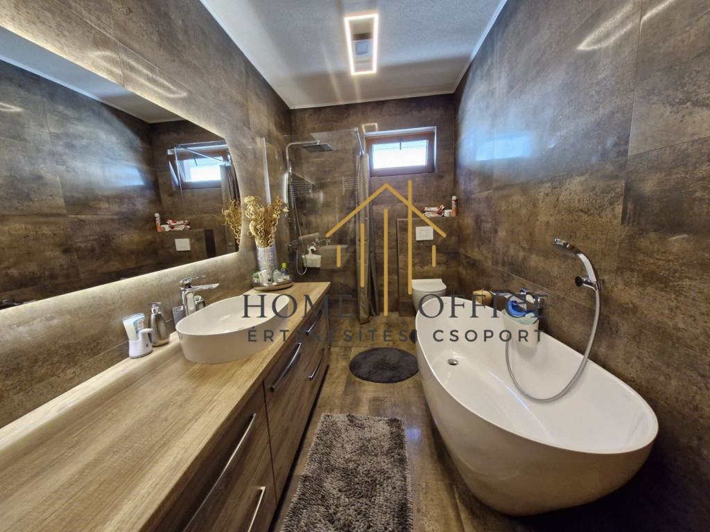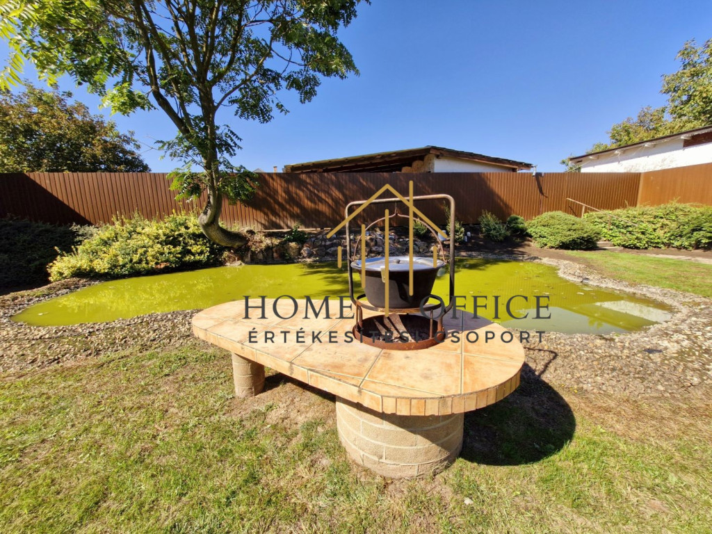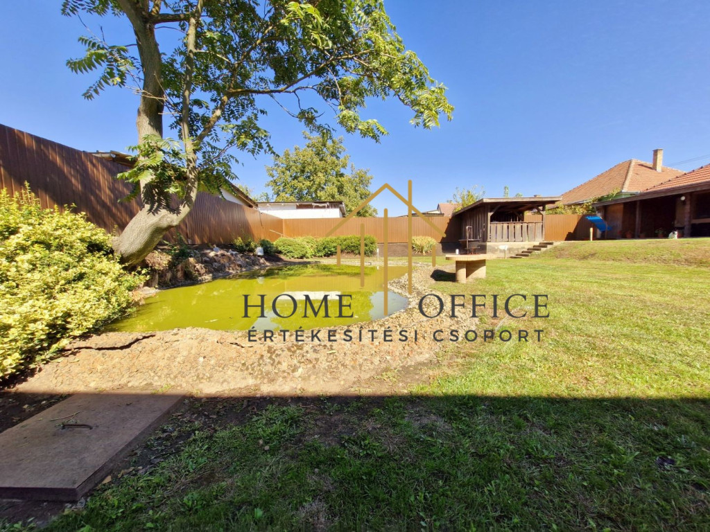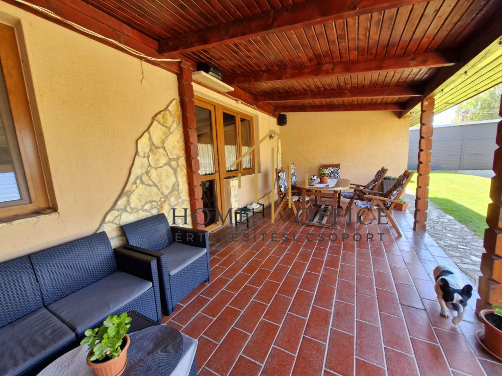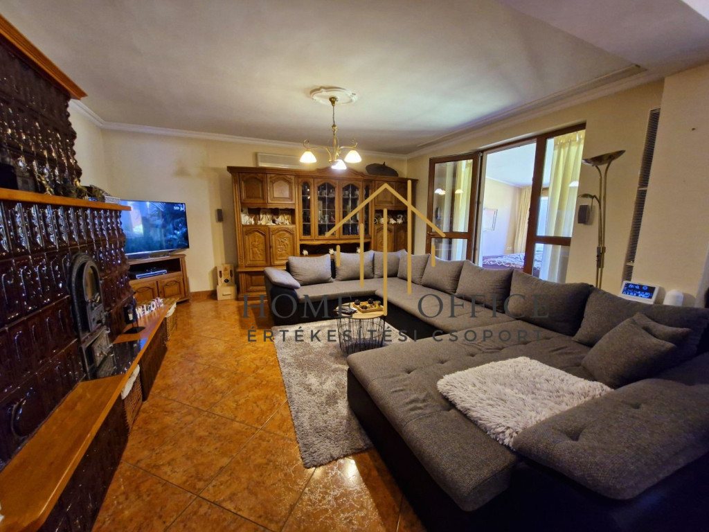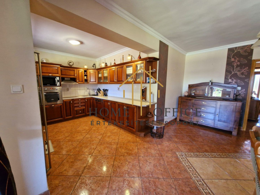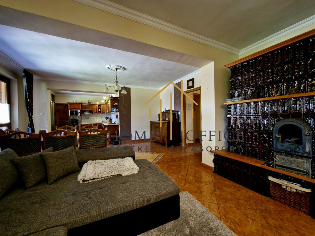 A 150 nm-es családi ház az üzleti résztől elszeparáltan helyezkedik el, szépen füvesített kertrésszel, mesterséges kis tóval, filagóriával, sütögető hellyel. Nappali+3 szoba, fürdőszoba, nagy étkező-konyha, külön wc, mosókonyha és gardrób. A fűtést egyedi gázkazán biztosítja, de a házban egy vízteres épített cserépkályha kandalló van a fűtésrendszerre kötve, ami mind a ház, mind az üzlethelyiség fűtését biztosítja. A ház tetőterében egy szoba beépített, de az egész tetőtér beépíthető.