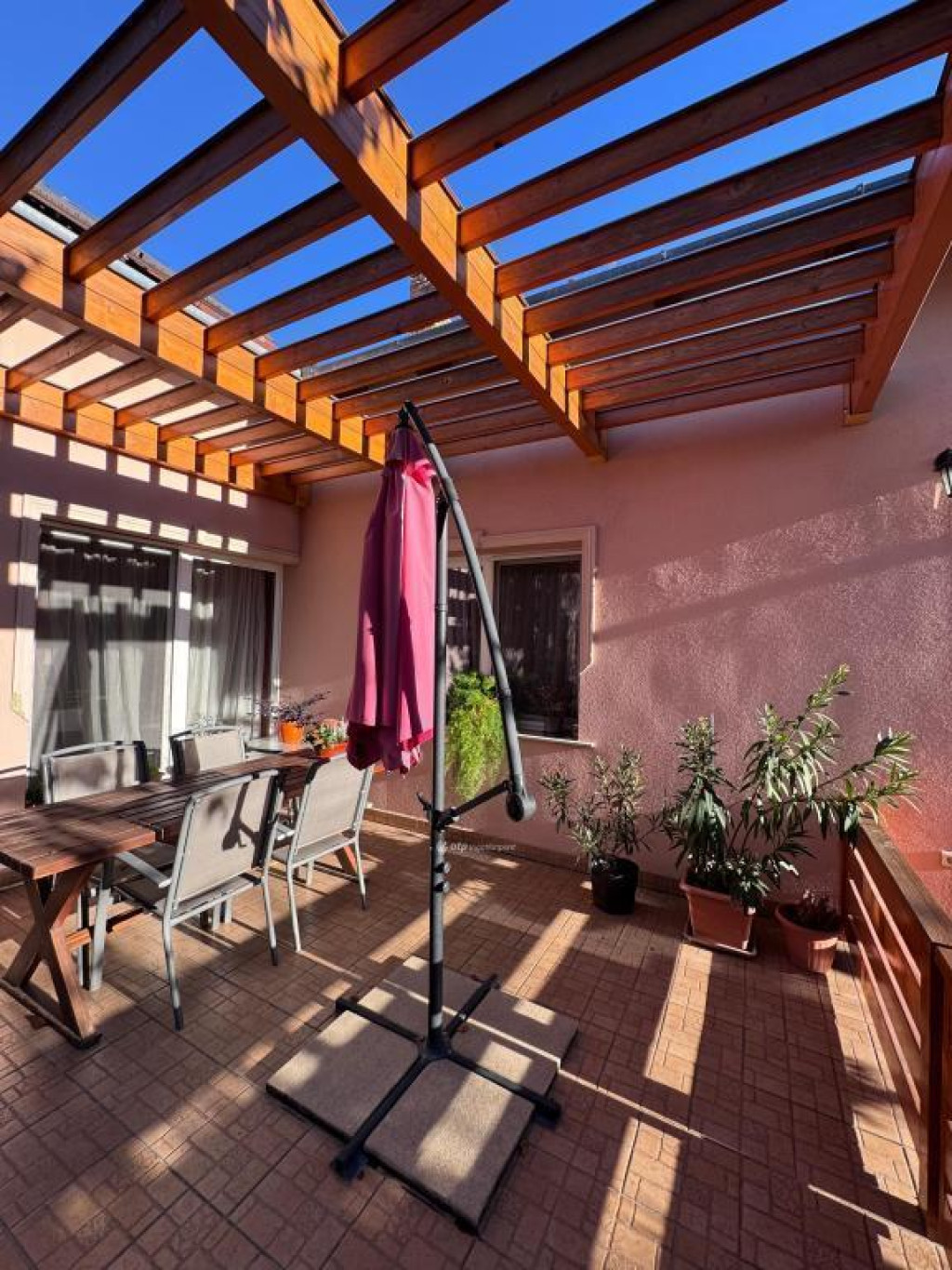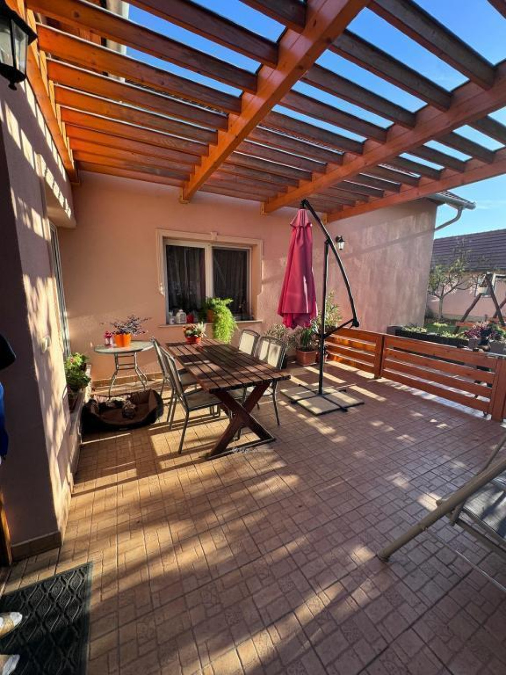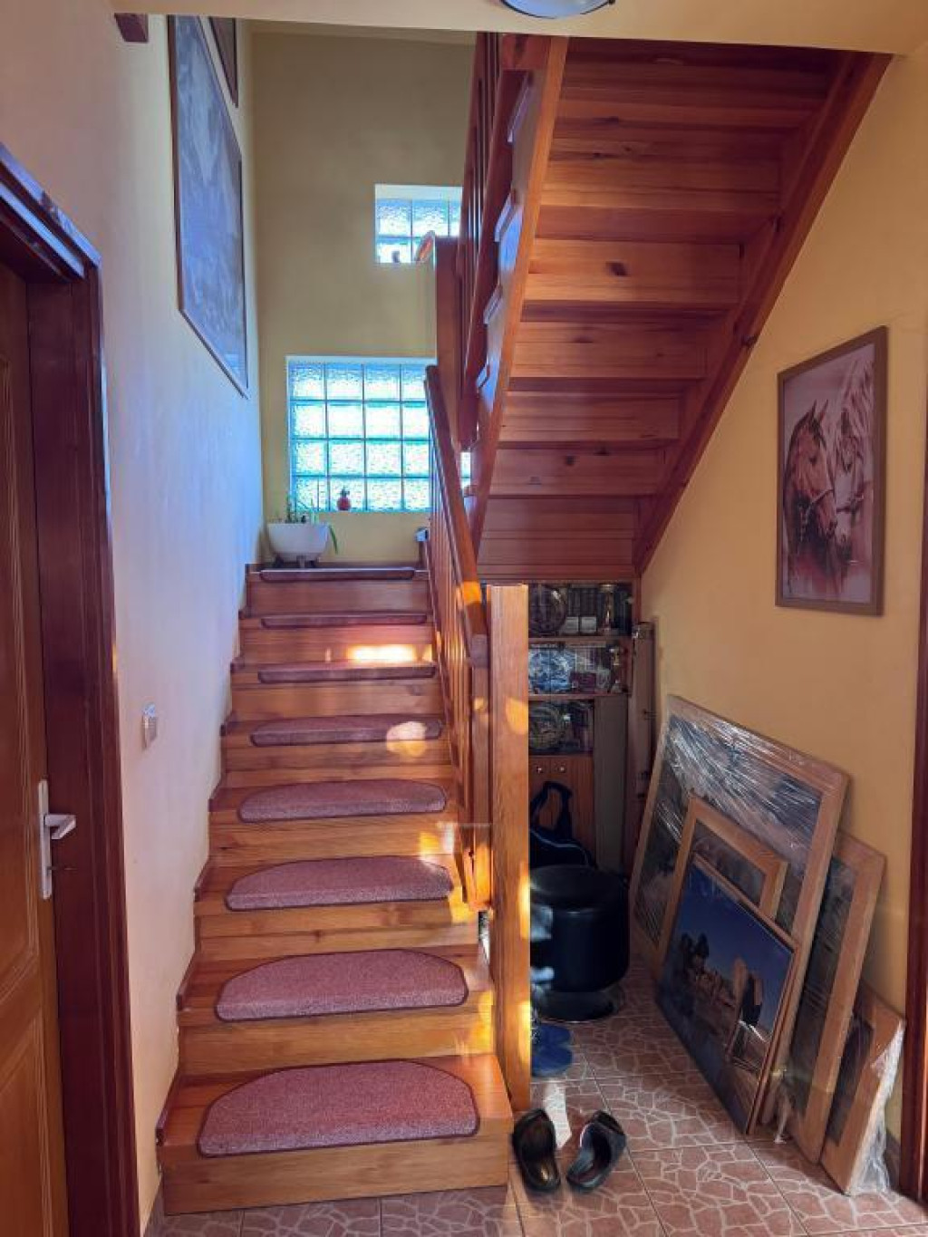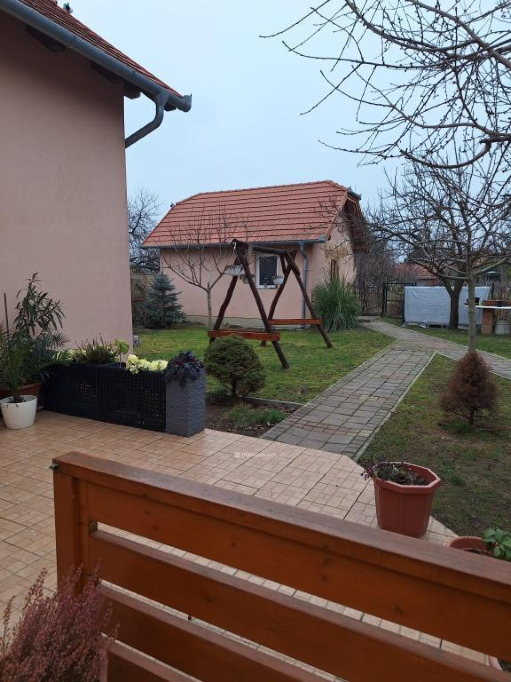 A ház 2005-ben épült, jól átgondolt egyedi igények alapján, kiváló minőségű anyagokból. A tulajdonosok nagy figyelmet fordítottak az energiatakarékosságra így napelem rendszert építettek ki. Bár a házat 44-es porotherm téglából építették, kapott még 5 cm szigetelést, a tökéletes hőmegtartás érdekében. Van fúrt kút, szivattyúval. A házban 3 hálószoba, nappali, két fürdőszoba és konditerem szolgálja a benne lakók kényelmét. A konyhában gondosan megtervezett helytakarékos, igényes egyedi konyhabútor, minden extrával ellátva. A nappaliban és a szobákban egyedi méretre készült bútorok vannak, rengeteg tárolási lehetőséggel. A fűtést gázkazán biztosítja, illetve egy szép cserépkályha, ami igazán hangulatossá teszi a hideg téli estéket és önállóan is befűti az egész házat. Az emeleti tetőtér jelenleg részlegesen van beépítve, előtér és konditerem van fent. A tetőtér többi része, kb. 70 m2-es terület még igény szerint kialakítható. A házban van garázs, amiből rögtön az előszobába vezető ajtón tudunk a hideg és az eső elől elzártan, kényelmesen kipakolni az autóból. A nagy 35 m2-es hangulatos pergolás terasz biztosítja, hogy egy hosszú nap után megpihenhessünk és gyönyörködhessünk az udvarban virágzó bokrok, gyümölcsfák között, vagy ha kedvünk van kicsit kertészkedhetünk is a konyhakertben. Az udvaron továbbá van még egy kedves kis 30 m2-es melléképület, ami kis átalakítás után akár vendégházként is funkcionálhat.