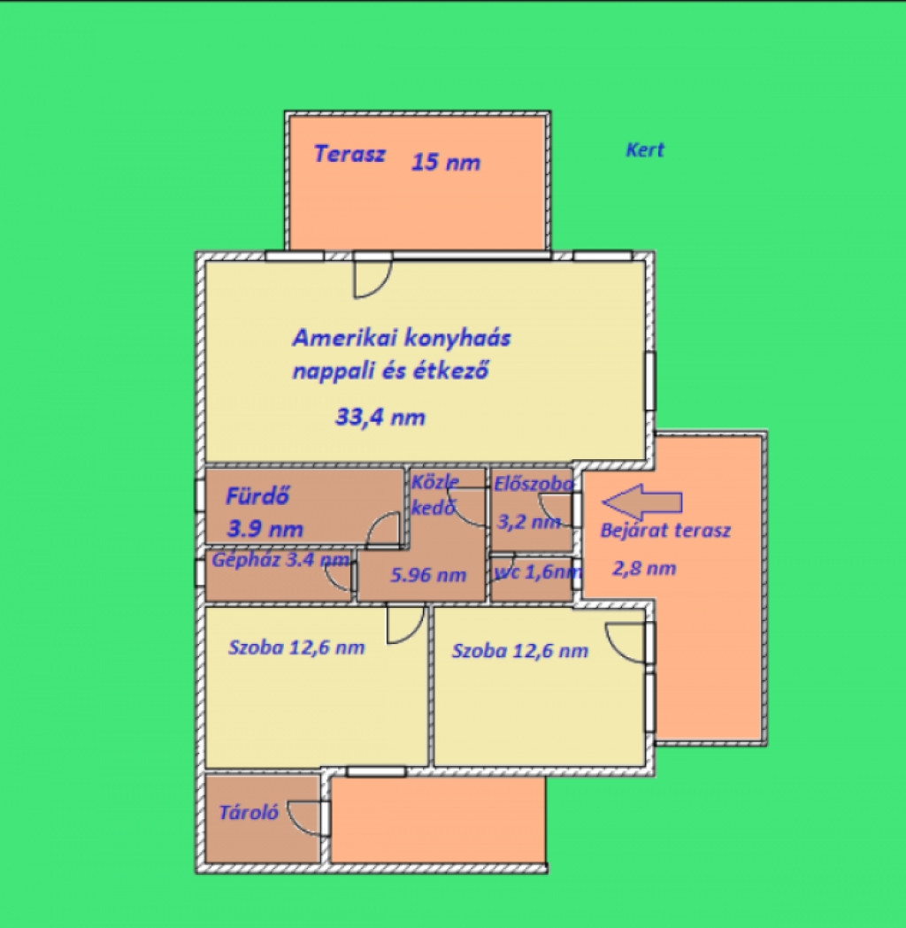 Fontos előny: a ház csak a tárolón keresztül érintkezik a másik lakóegységgel – így a teljes nyugalom és privát tér garantált.