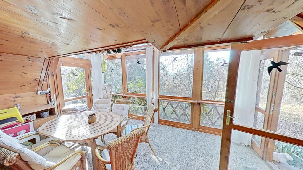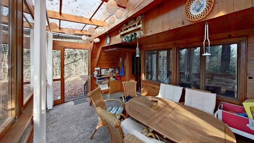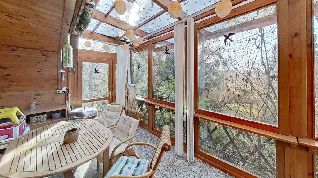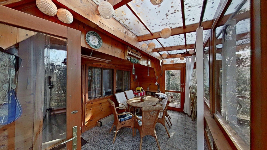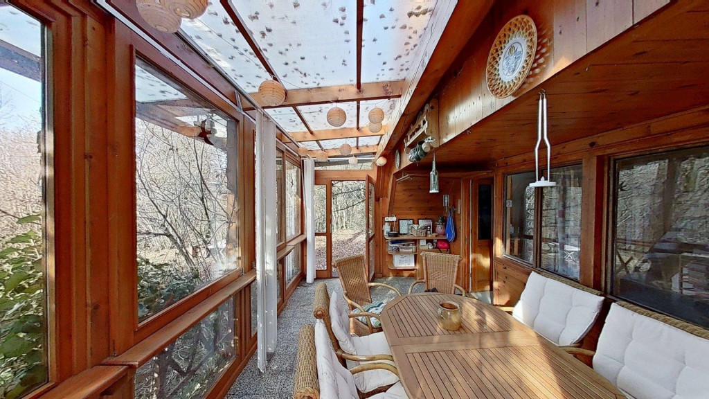 A kibővített egykori ház egy nagyon hangulatos, csupa üveg, zárt teraszt kapott, ami méltán a család kedvenc helye. Innen belépve a házba egy nyaralóhoz képest meglehetősen tágas, egy légterű, amerikai konyhás nappali fogad minket, és innen nyílik a fürdő is.