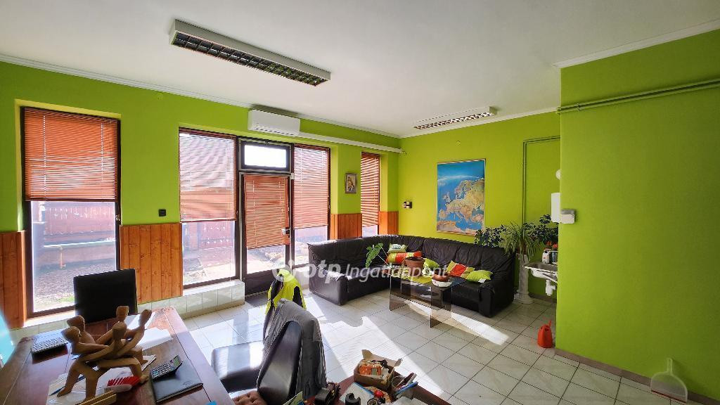 2 bejárattal rendelkezik, a házból nem átjárható, 5 helyiségből áll (tekintse meg az alaprajzot). Az irodarészként használt területet egy boltív választja el, a 34,8 m2-es helyiségbe az utca felől nyílik ajtó, szemben vele pedig a műhelyből léphetünk be az előtérbe a másik ajtón keresztül. Rendelkezik egy WC helyiséggel, mely elég nagy ahhoz, hogy fürdőszobaként kerüljön hasznosításra. Az itteni tárolóban pihen a 2 db gázkazán: az iroda és a ház területétnek fűtéséről külön-külön gondoskodnak. Az irodarész rendkívül tágas, funkcióját tökéletesen ellátja, ügyfelek fogadására, iratok tárolására vagy akár bemutatóterem kialakítására alkalmas.