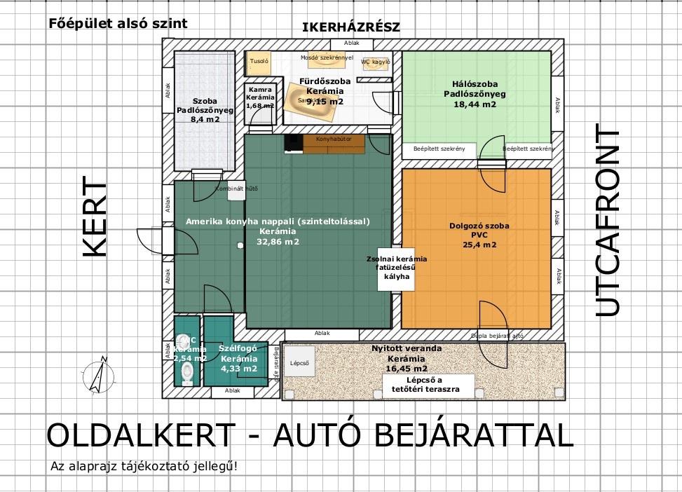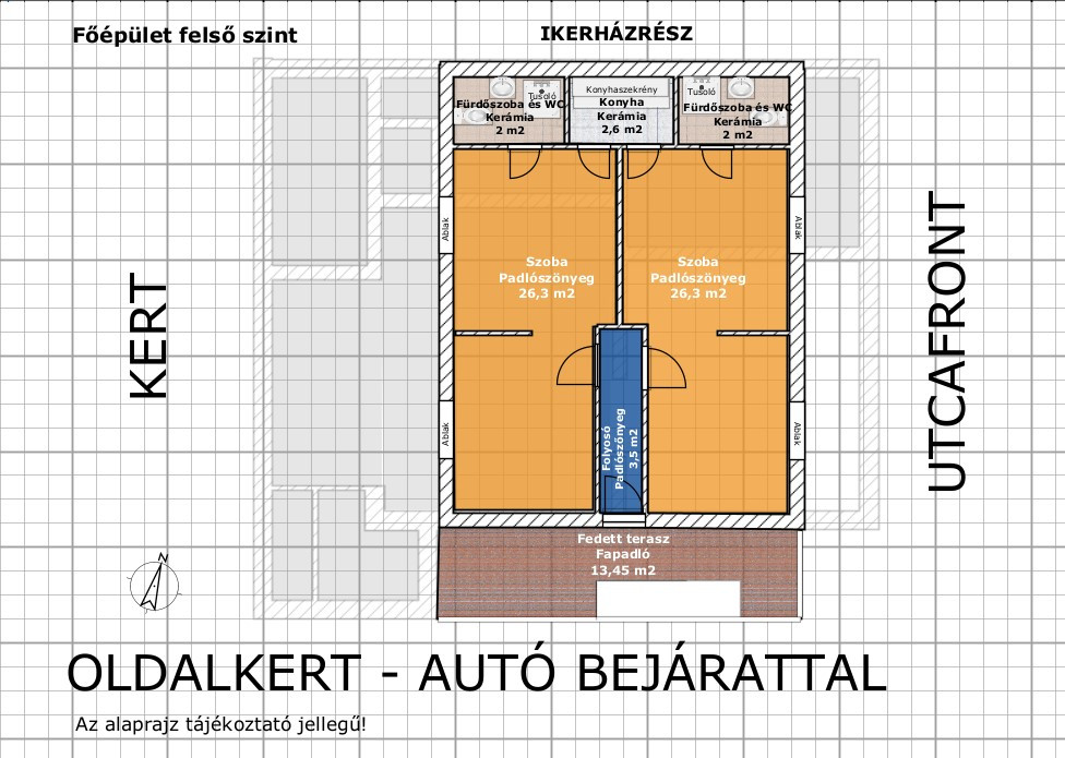 Orosháza belvárosában, 496 m2-es, közművesített, bekerített területen elhelyezkedő tetőtér beépítéses ikerház. Földszinten 125 m2 alapterületű, N + 2 ,5 szobás, összkomfortos lakás, központi fűtéssel, valamint beépített vízteres csempekályha. A tetőtérben 80 m2 alapterületű,2 szobás, összkomfortos külön-bejáratú lakás (apartman). Az épület tégla falazatú, szigeteléssel,valamint 10 KW-os napelemmel ellátott. Gazdasági épület és a garázs alapterülete 70 m2, tetőtérbeépítés 55 m2. Az épület alatt 8 m2-es pice található. Mindkét épület külön gázmérővel rendelkezik.