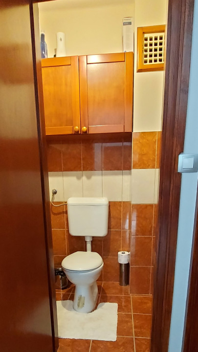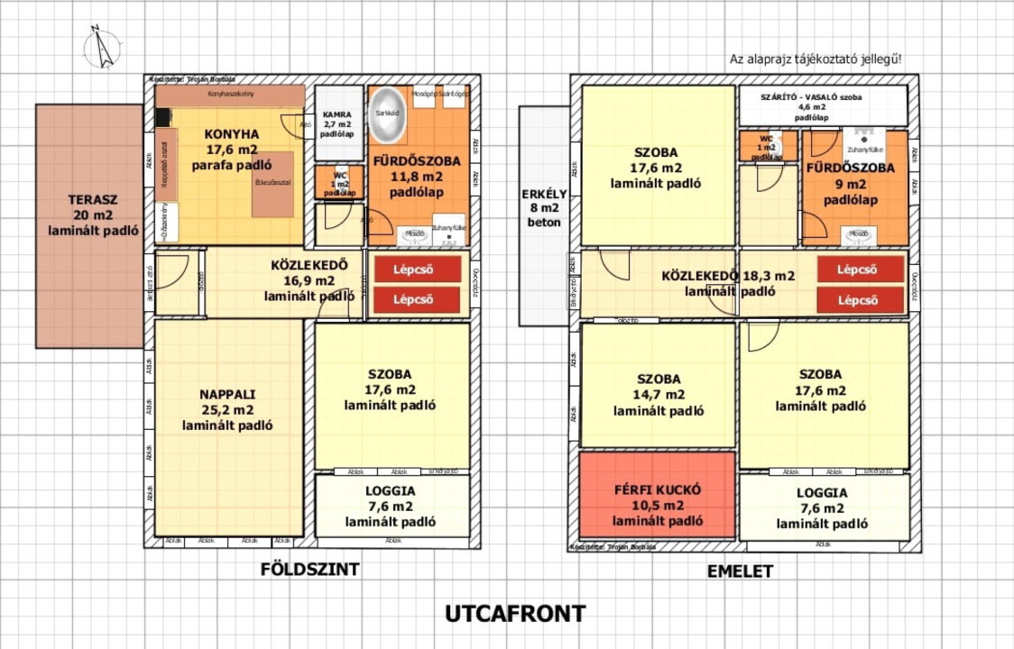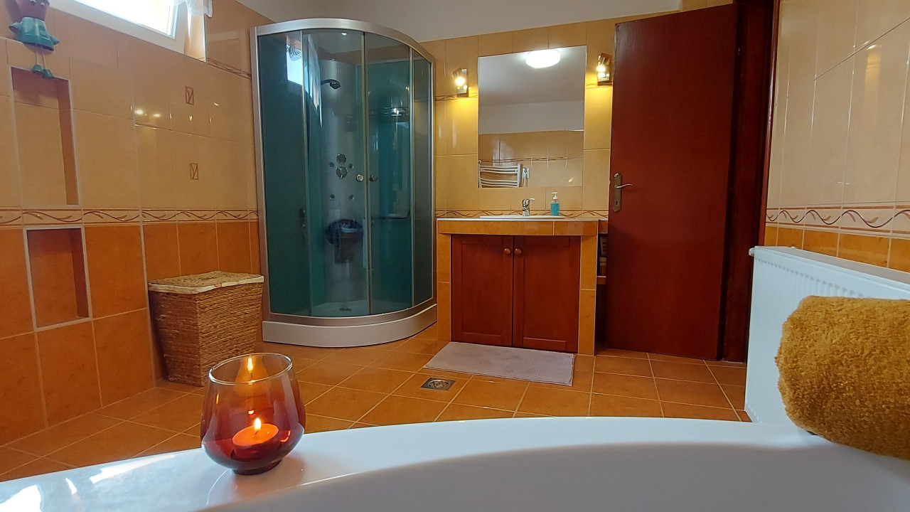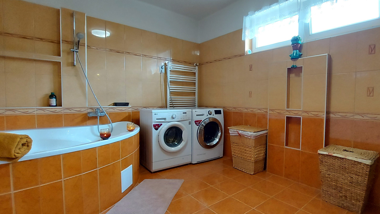 - Emeleti fürdő (9 m²): Zuhanyzós, amihez egy praktikus mosó- és vasalószoba (4,6 m²) is kapcsolódik. A WC itt is külön helyiségben.