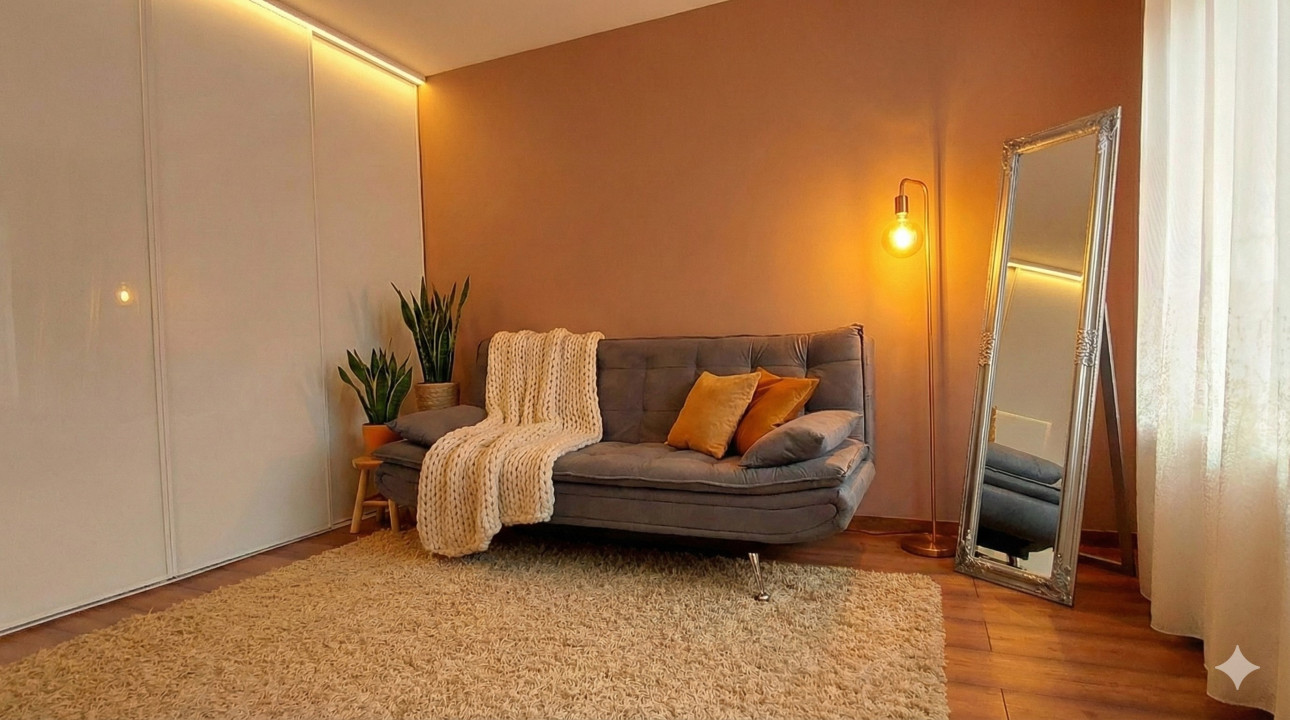 - Hálószoba (17,6 m²): Innen nyílik egy különlegesség: a hobbiszoba (10,5 m²), ami üvegezett loggián át közelíthető meg.