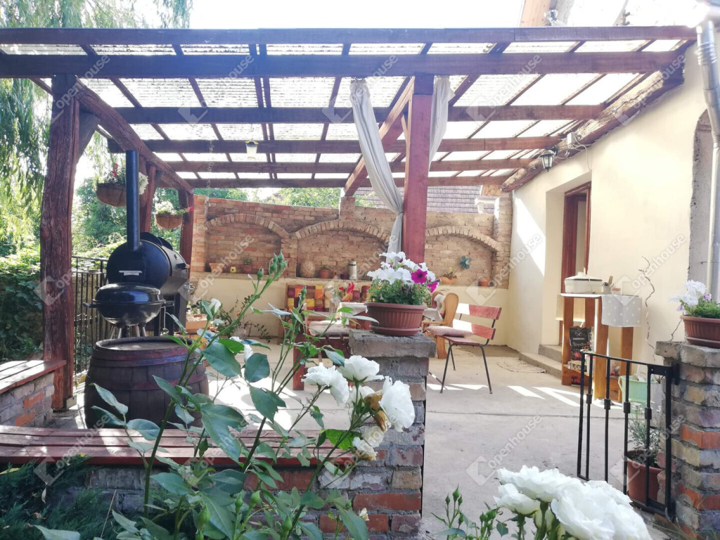 A nappaliból nyílik egy gyönyörű fedett terasz, amely régi, címeres téglából készült, autentikus rusztikus hangulatot teremtve. Ez a stílus természetes, történelmi karaktert kölcsönöz a kertnek, amely tökéletesen illeszkedik a vidéki környezethez.