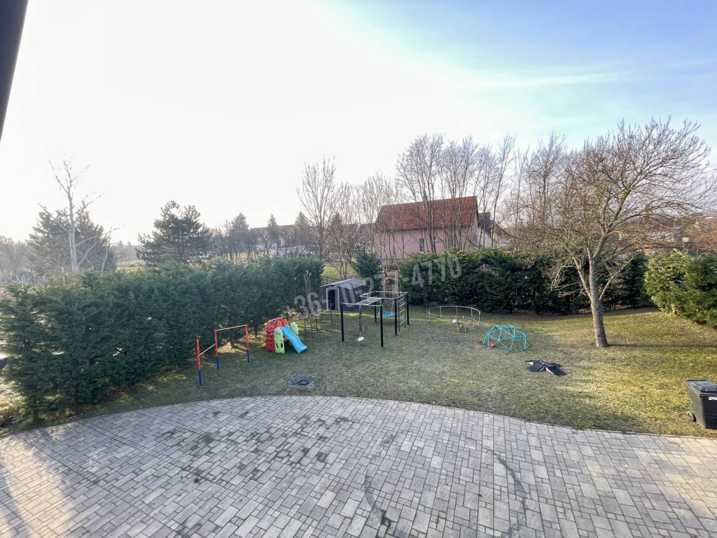 A teljesen körbekerített udvar rendezett, parkosított, játszótér is lett kialakítva -akár tiniknek is megfelelő-. Bár egy locsolásra alkalmas bő vizű ásott kút van az udvarban, de külön locsoló vízóra is lett bekötve.