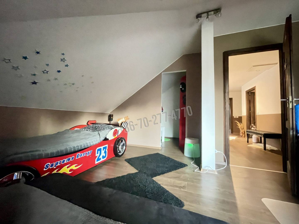 A ház bruttó alapterülete 12.8m x 9m. A hasznos alapterület az egyedi építészeti megoldások miatt 135 m2-es, 4 hálószobás, 2 fürdőszobás, két gardrob szobás. A teljes tetőtér beépítésével készült az ingatlan, így két szintes ez az egyedi kialakítással és minőségben 2015-ben épült családi ház.
