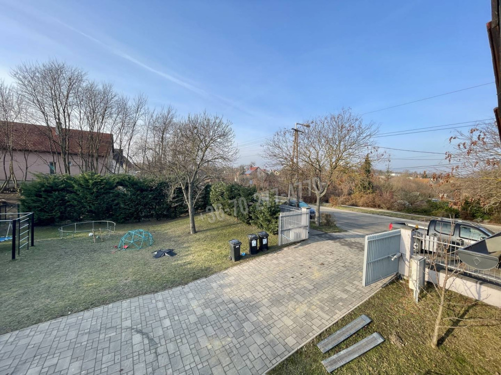 A térkövezett udvarra elektromos nagy kapun keresztül gépjárművel is be lehet hajtani, vendégek fogadására egy kiskapu vezet a főbejárathoz. Az udvaron egy különálló, könnyű szerkezetes garázs (Hörmann elektromos ajtóval szerelve, duplán hőszigetelve), és egy könnyűszerkezetes fészer található. Az előbbibe villanyautótöltő töltőhely is ki lett alakítva, az utóbbiba a villany lett bevezetve.