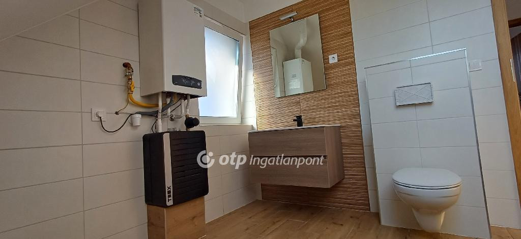 Heves megye, Ostoros, Tópart lakóparkban, új építésű, 92/100 m2 alapterületű (+ terasz és gépkocsibeálló), földszint + tetőteres kialakítású, ikerház eladó. Az elkerített telek 397 m2. Az épület 30 cm vastag POROTHERM, 30 X-THERM tégla falazatú, 10 cm szigeteléssel rendelkezik. A nyílászárók fehér színű pvc szerkezetűek, hőszigetelt üvegezéssel, szellőztető zsalus kialakítással, elektromos redőnyökkel van felszerelve. Az otthon melegét Ariston kondenzációs kazán biztosítja. A földszinten padlófűtés és radiátoros fűtés, az emeleten radiátoros fűtés lett kialakítva. Concept hűtő-fűtő klíma is be lett szerelve.