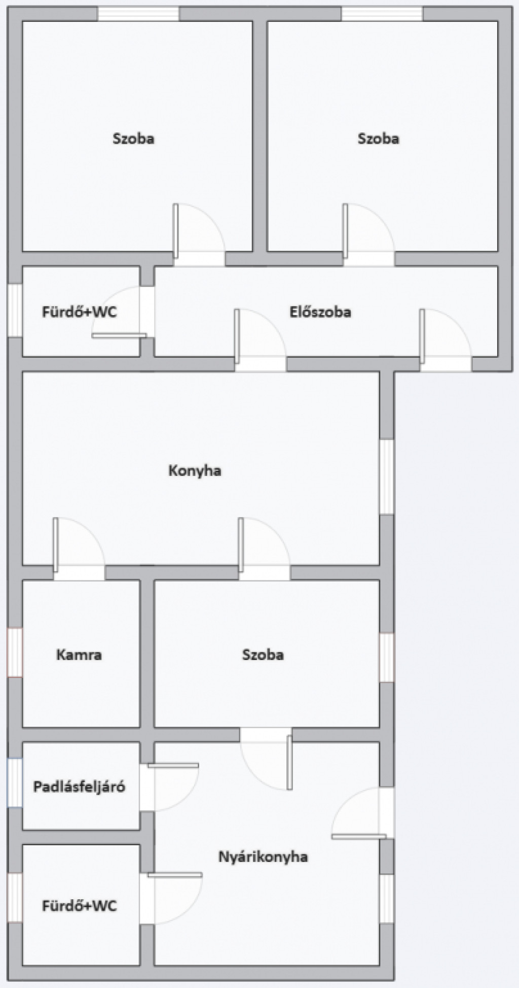 A nagyobbik rész: előszoba, 3 szoba, nagy étkezős konyha, kamra, fürdőszoba WC-vel, helyiségekből áll. / A fürdőszobára igény szerint rá fér a modernizálás, de jelen állapotában is használható.