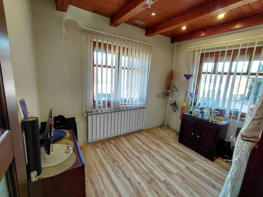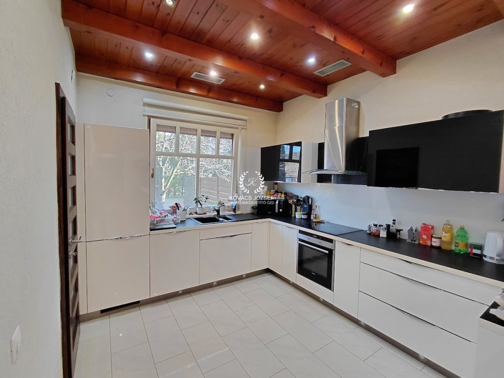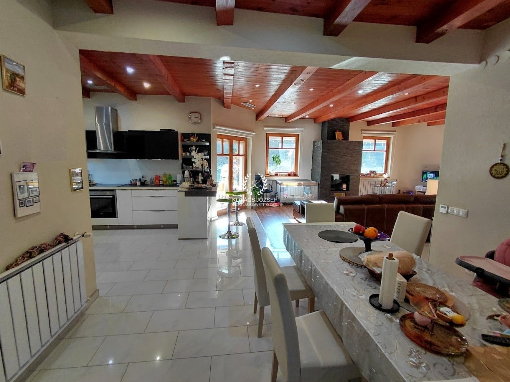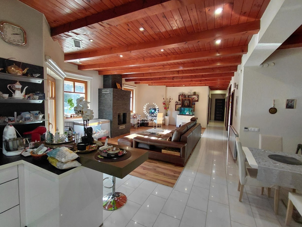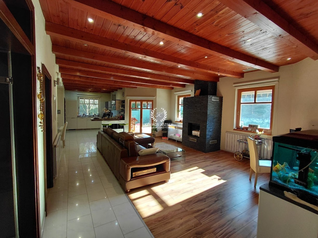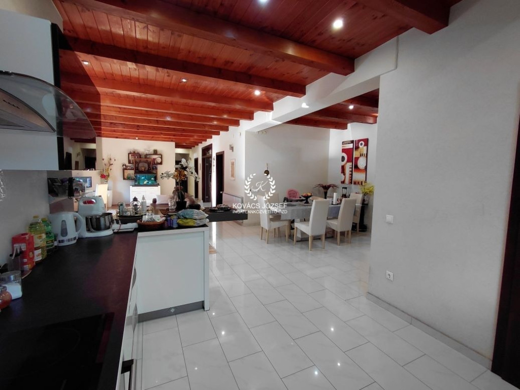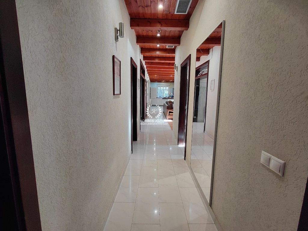 A különleges melegséget árasztó fa mennyezet, látszó gerendákkal, beépített LED lámpákkal az egész házban végigkiséri a tekintetet, még otthonosabbá téve ezt a remek elrendezésű házat.