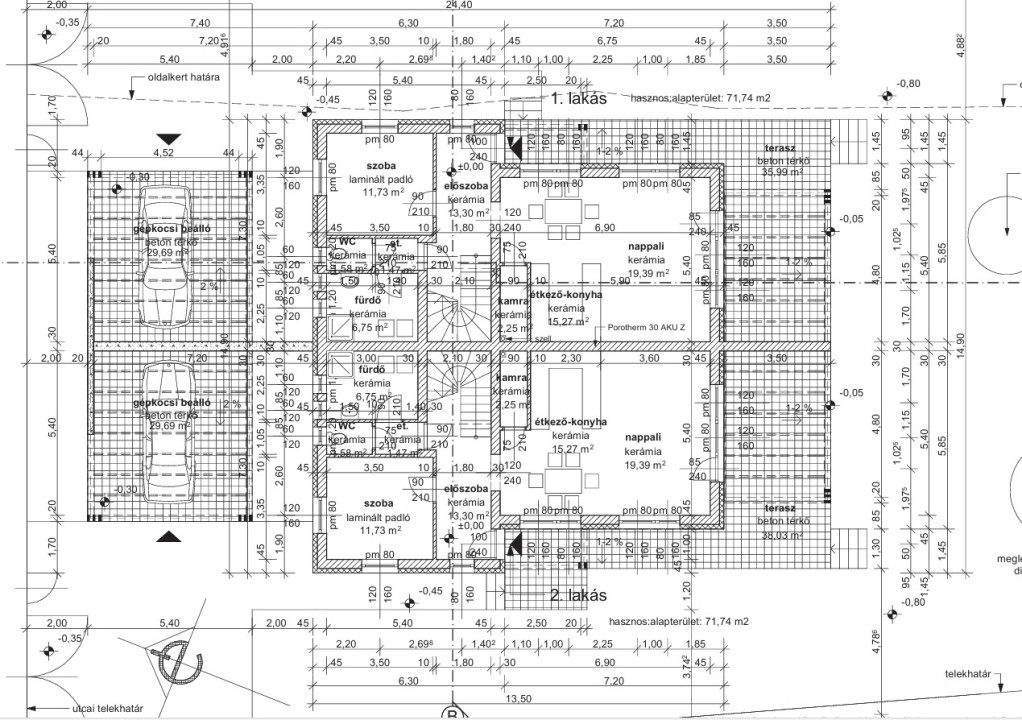 A földszint lakható alapterülete 62 nm melyben egy előszoba, amerikai konyha étkező nappali, 1 hálószoba, fürdő, Wc, spájz,+ egy 36 nm-es terasz és + egy 30 nm-es autóbeállási lehetőség kerül megépítésre