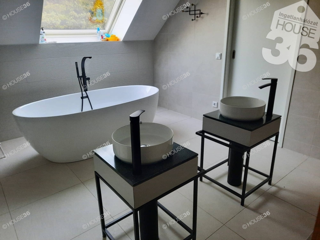 Két darab átlagos nappali méretű fürdő, és ezekkel közvetlen kapcsolatban álló lakószobák foglalnak helyet az épület két oldalán.
