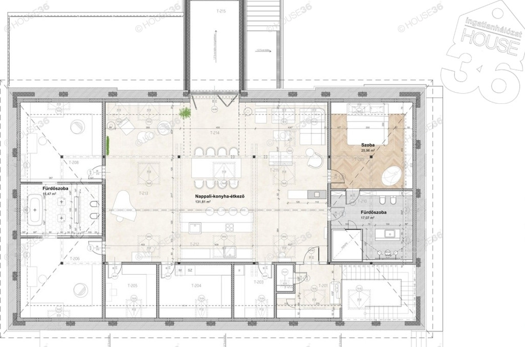 A rendkívül robusztus födém acél szerkezettel való megerősítését követően kialakításra került egy impozáns, első emeleten elhelyezkedő tágas luxus lakrész. Az elrendezés meghatározó központi elemét képezi a 130 négyzetméteres, legmagasabb pontján 7,5 méter belmagassággal rendelkező nappali. A helyiségbe belépve azonnal szembe ötlik a részben látszó gerendás tetőszerkezet és a központi helyet elfoglaló étkező asztal. Szemközt bal oldalon 30 négyzetméteres játszó sarok, vele átellenben felnőtteknek felhőtlen szórakozásra kialakított terület található.