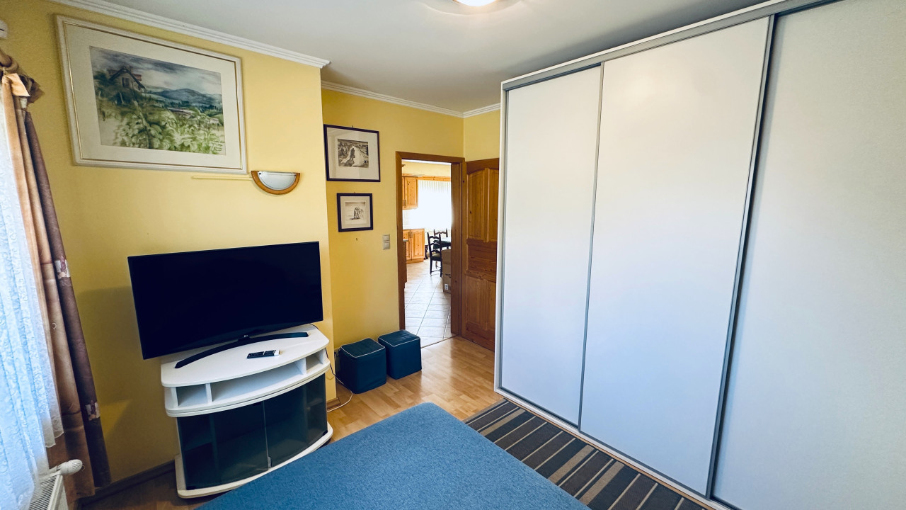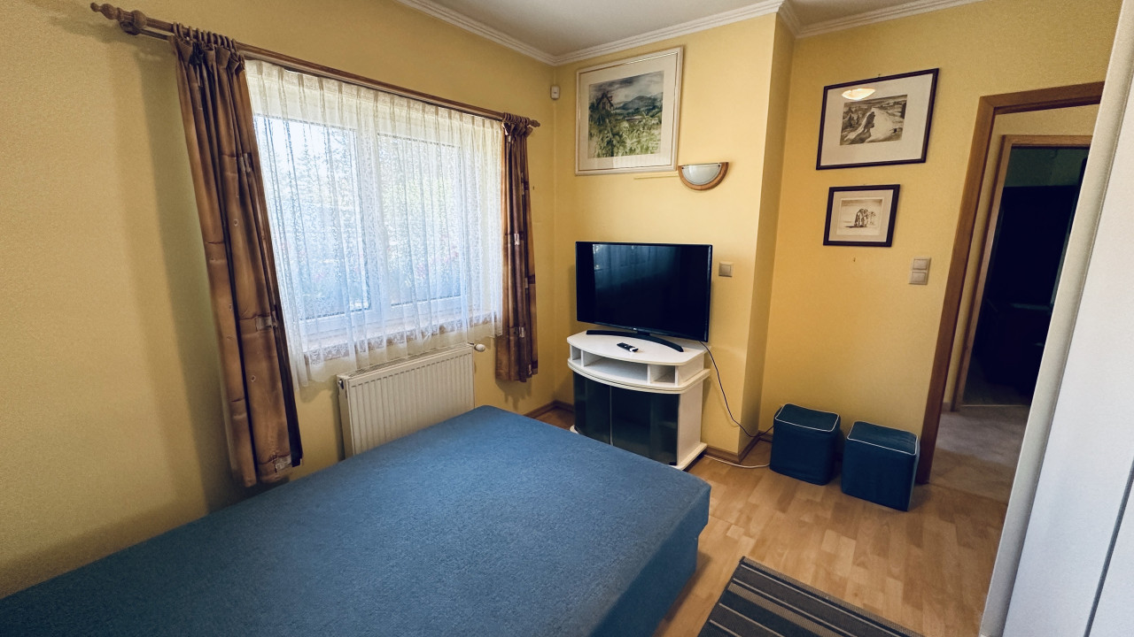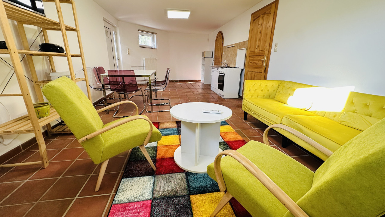 A szuterén szinten vendégek fogadására alkalmas lakás található, melyben konyha, étkező, nappali, hálószoba és fürdőszoba került kialakításra.