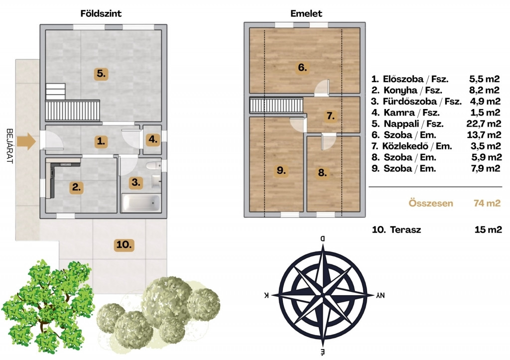 Elosztása: terasz, nappali, étkezős konyha, fürdőszoba + WC, emeleten 3 külön nyíló szoba.