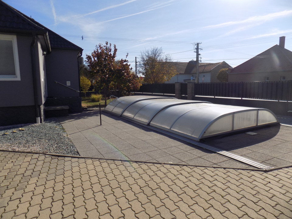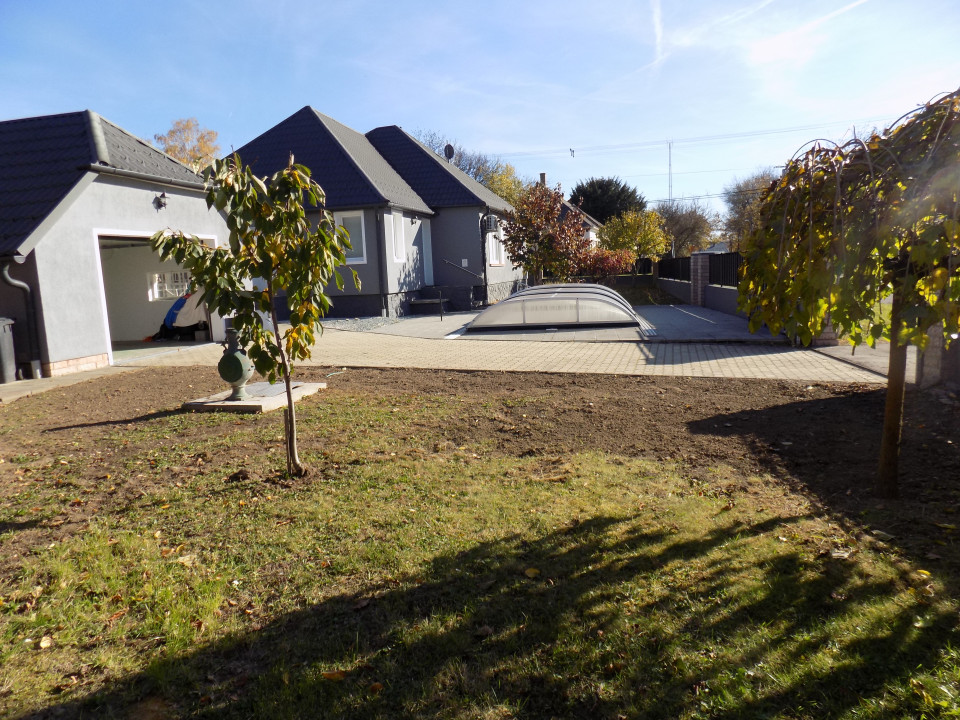 A saroktelek minden irányból aszfaltos úton megközelíthető, teljesen bekerített. az autóból csak a garázsban kell kiszállni: a kapu és a garázsajtó is automatizált. a garázsban egy gépjármű elhelyezésére van lehetőség, emellett mindkét oldalon van még hely, a háztartásban szükséges eszközök is elférnek, valamint ide szerelték be az udvaron lévő medence gépészetét. a medence egész évben használható, a sós víz fűtését hőszivattyú biztosítja. Ha használaton kívül van egyszerűen elhúzható fedél védi a benne lévő vizet. A garázs és a ház közötti kis épületben lehet olvasni, pihenni a fürdés után, hobbiszoba, játszóház vagy egyéb célra berendezni.