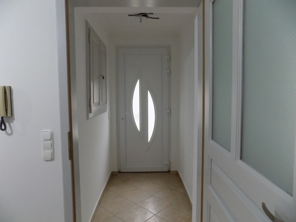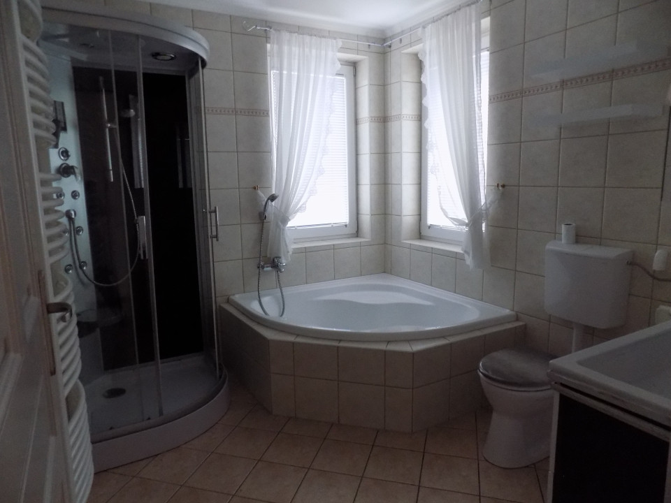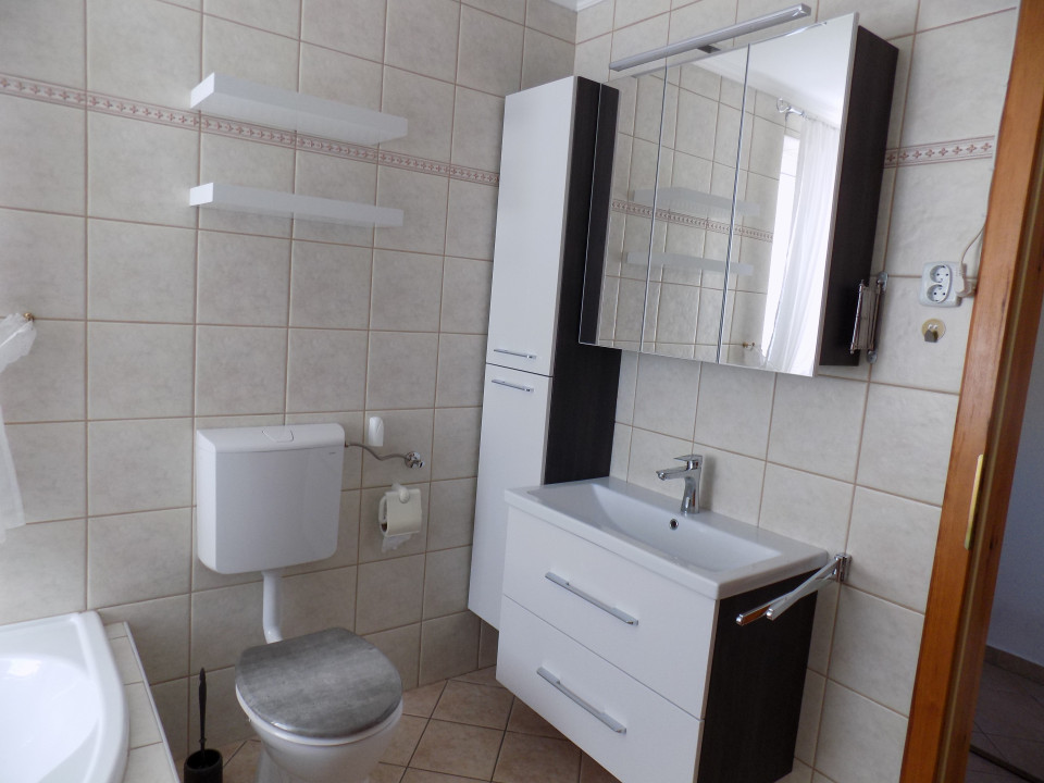 A családi ház két bejárattal rendelkezik. A garázshoz közelebb eső hátsó bejárat előszobájából egyik oldalon lépcső vezet a háztartási helyiségbe, ami mosásra, tárolásra egyaránt alkalmas, valamint innét nyílik a ház egy része alatt lévő pince is. A másik oldalon a szép, világos fürdőszoba található több funkciós zuhanypanellel ellátott zuhanyzóval, sarokkáddal, modern mosdóval.