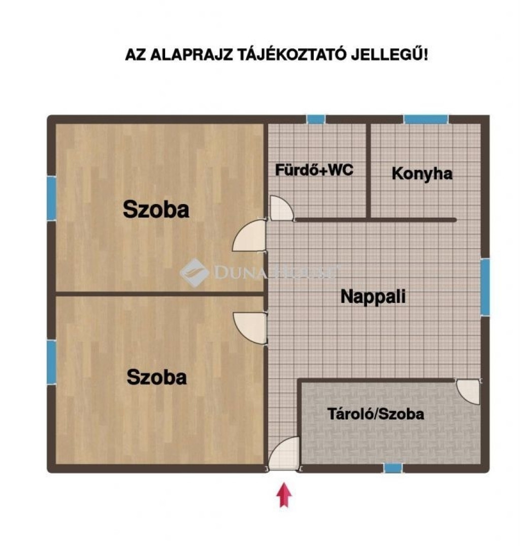 A ház elosztása praktikus és jól alakítható:2 külön nyíló szobatágas nappaliegy kisebb helyiség, amely jelenleg tárolóként funkcionál, de könnyedén szobává alakítható
