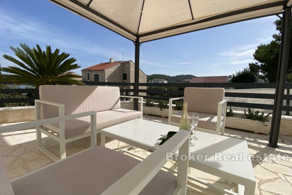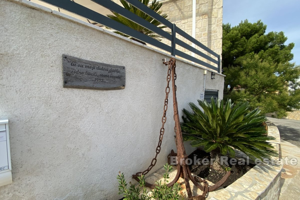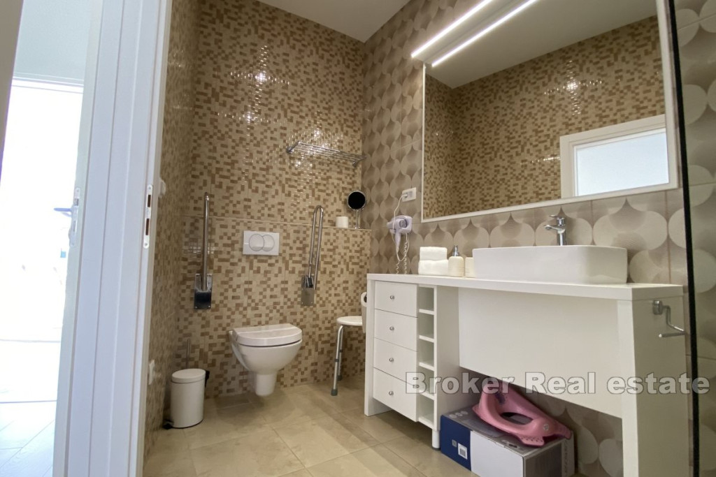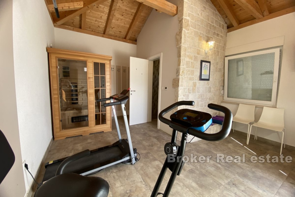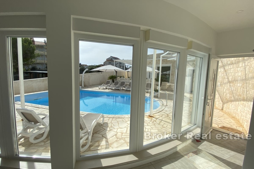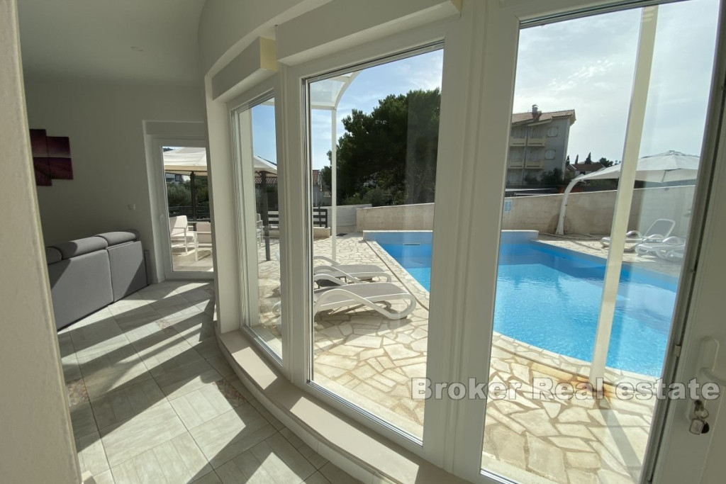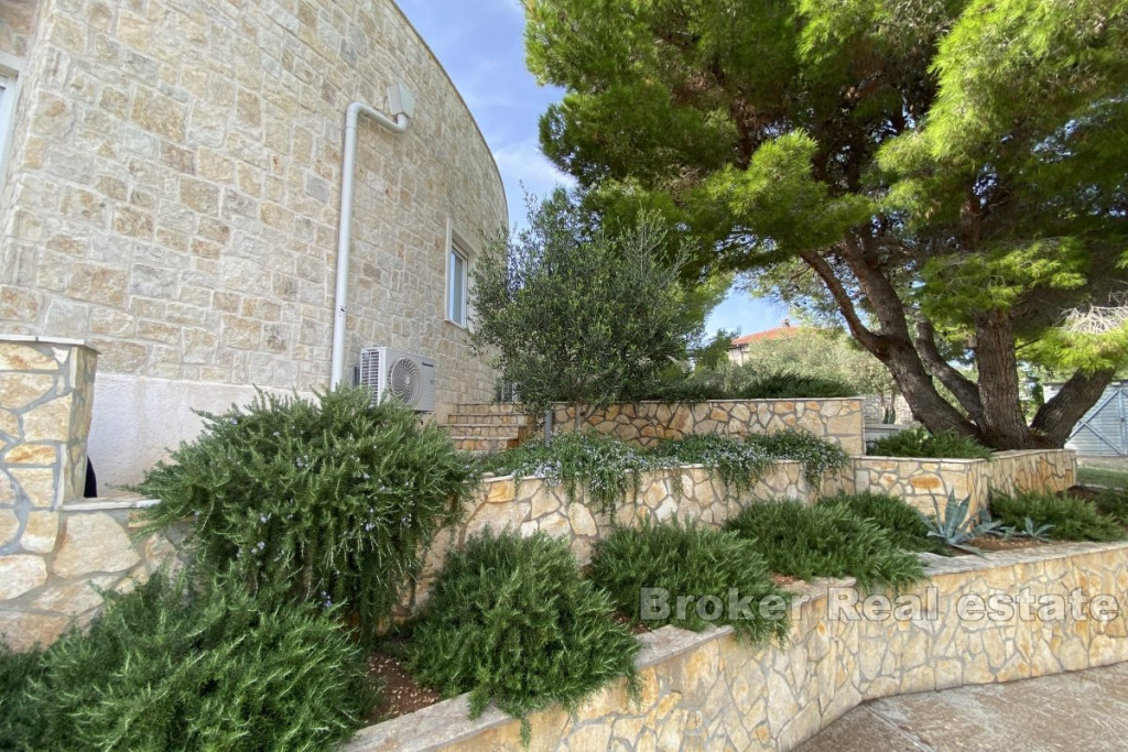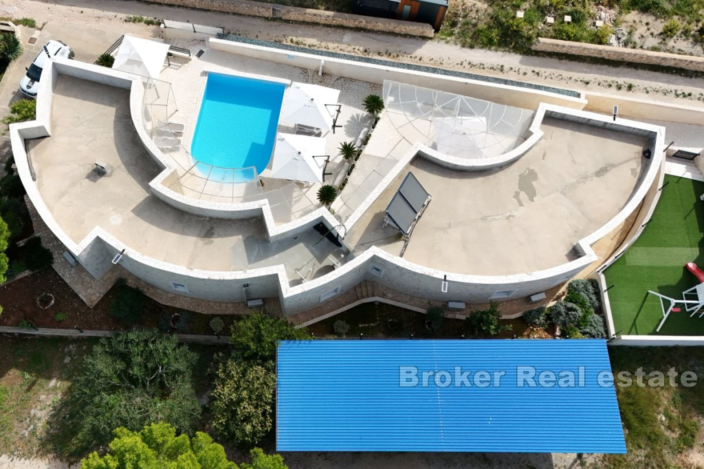 A villa is for sale on the island of Pašman, situated in the second row from the sea. This modern, oval-shaped villa combines contemporary architecture with nature. The property begins with a covered parking area for four cars, equipped with an electric vehicle charging station. Next to the parking is a gym with underfloor heating, featuring fitness equipment, a sauna, and a private bathroom. The villa consists of two completely separate units, with a pool as the central focal point. The upper living area includes an open-plan kitchen and living room, a hallway, and two bedrooms, each with a fully equipped bathroom. It is specially adapted for people with disabilities, allowing wheelchair access from the parking directly into the apartment, bedroom, and bathroom, all in accordance with the highest EU standards. Each room is air-conditioned, and the bathrooms have underfloor heating. The lower unit features a similar layout and size, with the same number of bathrooms, bedrooms, and an open-concept kitchen and living area. Between the two villas, there is a reception room where owners can check guests in and out, which can also serve as an office. It is equipped with a laptop, printer, and scanner. The entire property is paved and landscaped with typical Mediterranean plants such as rosemary, lemon, orange, and olive trees. In the basement, there is a pool equipment room, including an electrolysis device, pump, and other maintenance equipment for the property. The villa is located just 60 meters from the sea, and the ferry is a 10-minute drive away. The location is perfect for an active vacation, ideal for outdoor activities such as cycling. BROKER REFERENCE ID:2044/34