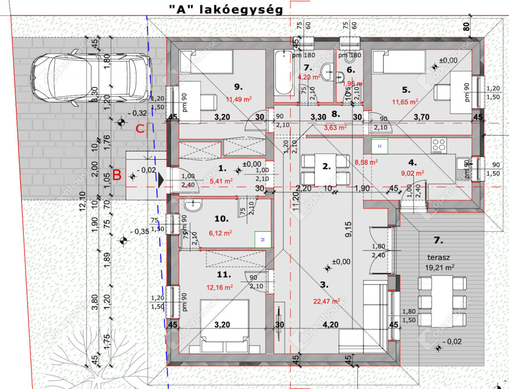 97 m²-es családi ház + 20 m² épített terasz kerámia burkolattal,