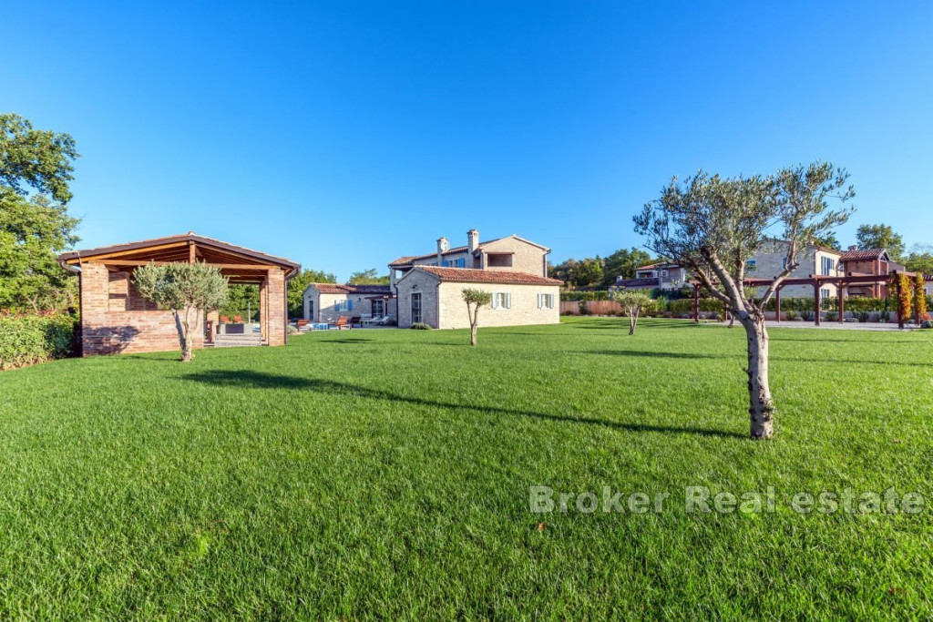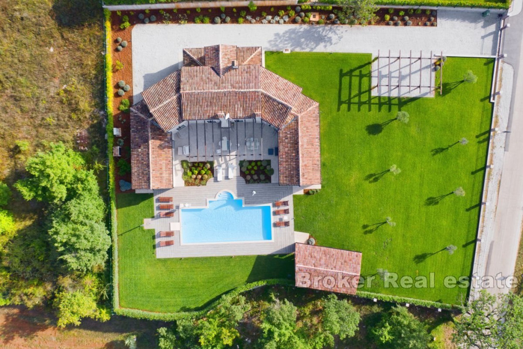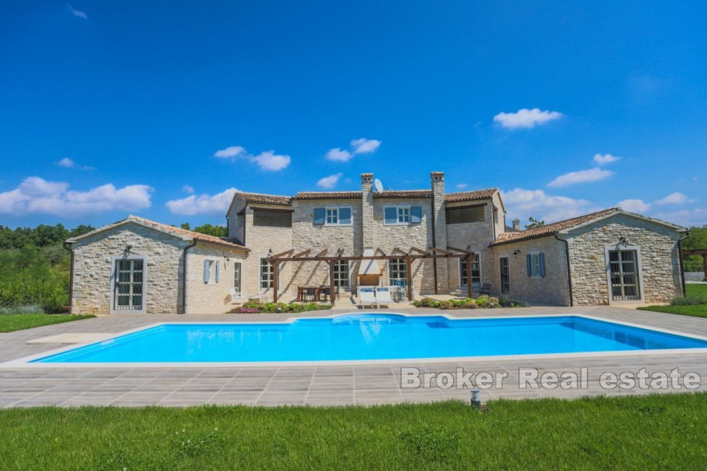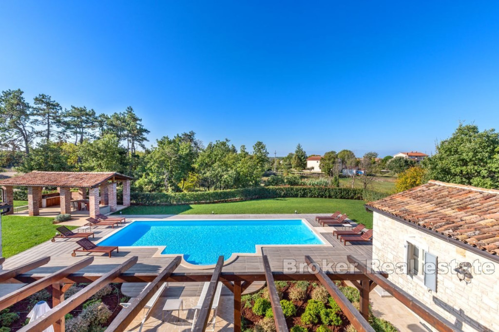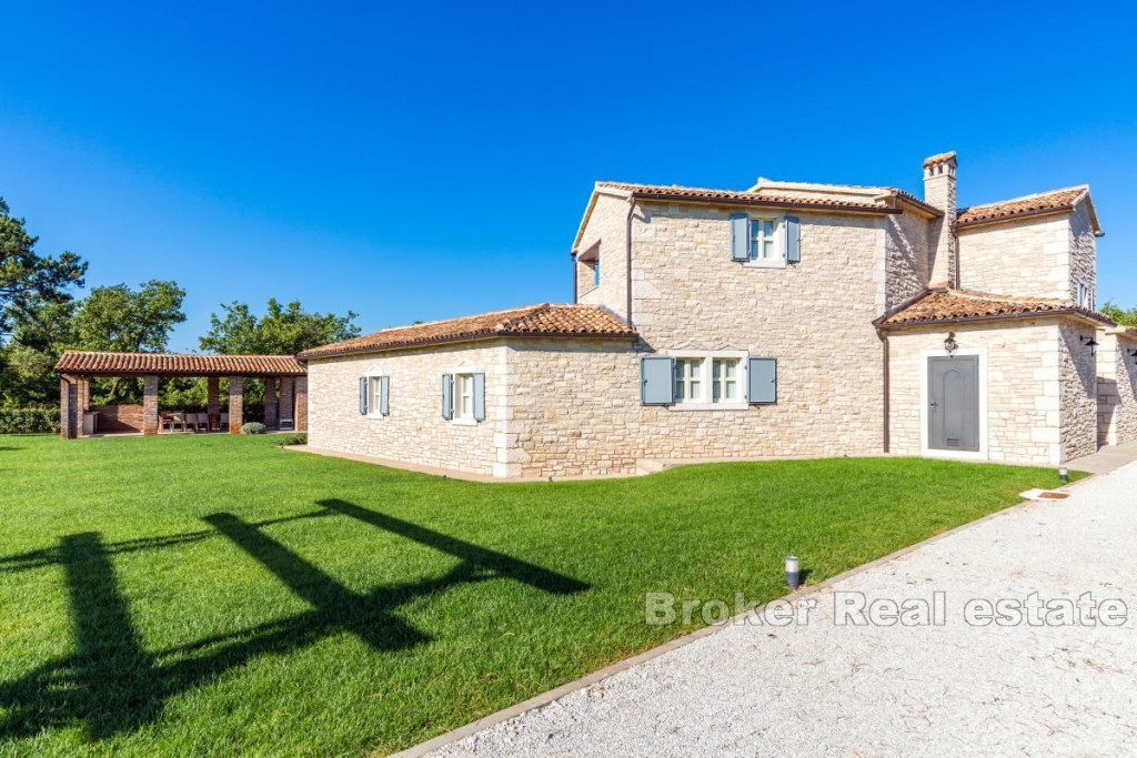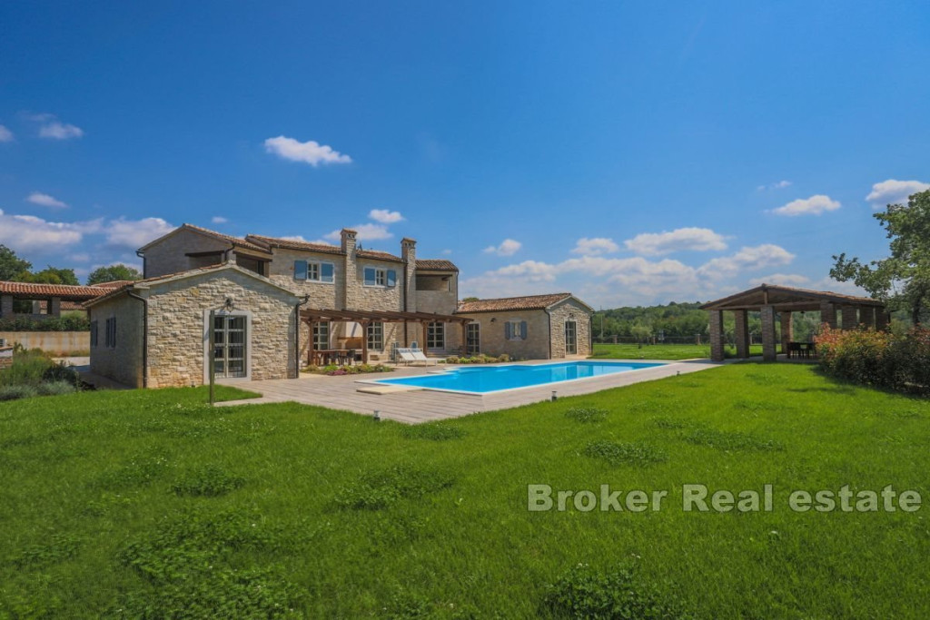 A beautiful stone villa for sale, located in the heart of Istria near Tinjan. This attractive villa offers an exceptional blend of traditional charm and modern luxury. Located on a spacious plot of 2347 m2, the villa has a total living area of 269 m2, elegantly distributed over two floors. The ground floor consists of an entrance hall, airy living room, kitchen, dining room, two comfortable bedrooms, each with its own bathroom and direct access to the terrace, pantry, boiler room and toilet. An internal staircase leads to the first floor, where there are two bedrooms, each with its own bathroom and a private loggia, offering a beautiful view and a peaceful atmosphere. The outdoor space consists of a beautifully landscaped garden, a sun-drenched pool with a sun deck and a summer kitchen with a grill ideal for entertaining outdoors. The entrance to the fenced yard is secured by sliding doors with remote opening, four parking spaces are provided for additional comfort. Built with the highest quality materials and fully furnished, this villa combines luxury with traditional Istrian architecture, offering a unique and inviting living experience. BROKER REFERENCE ID:1024/06