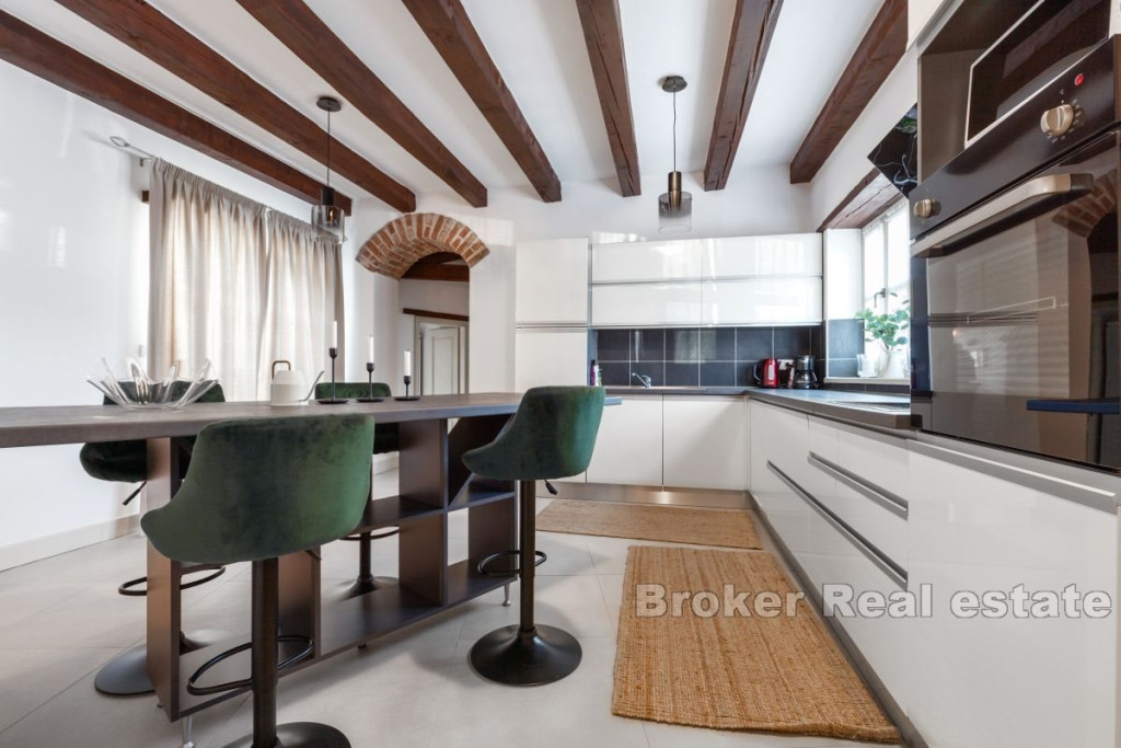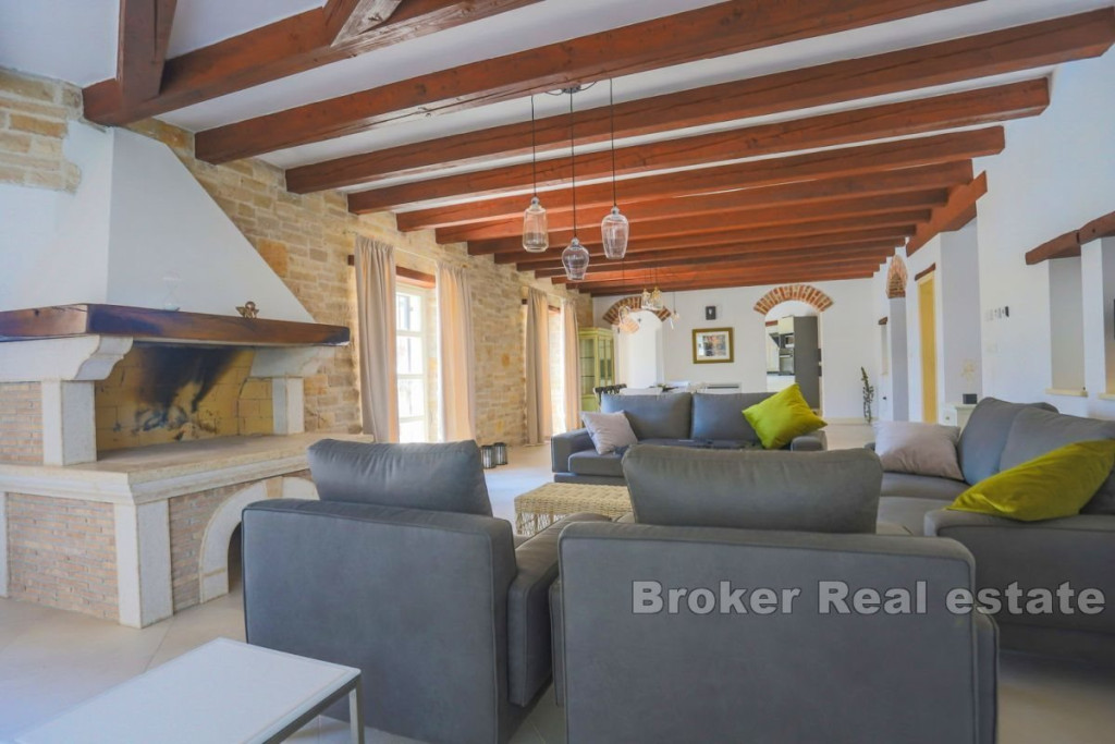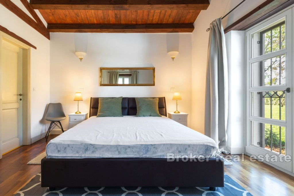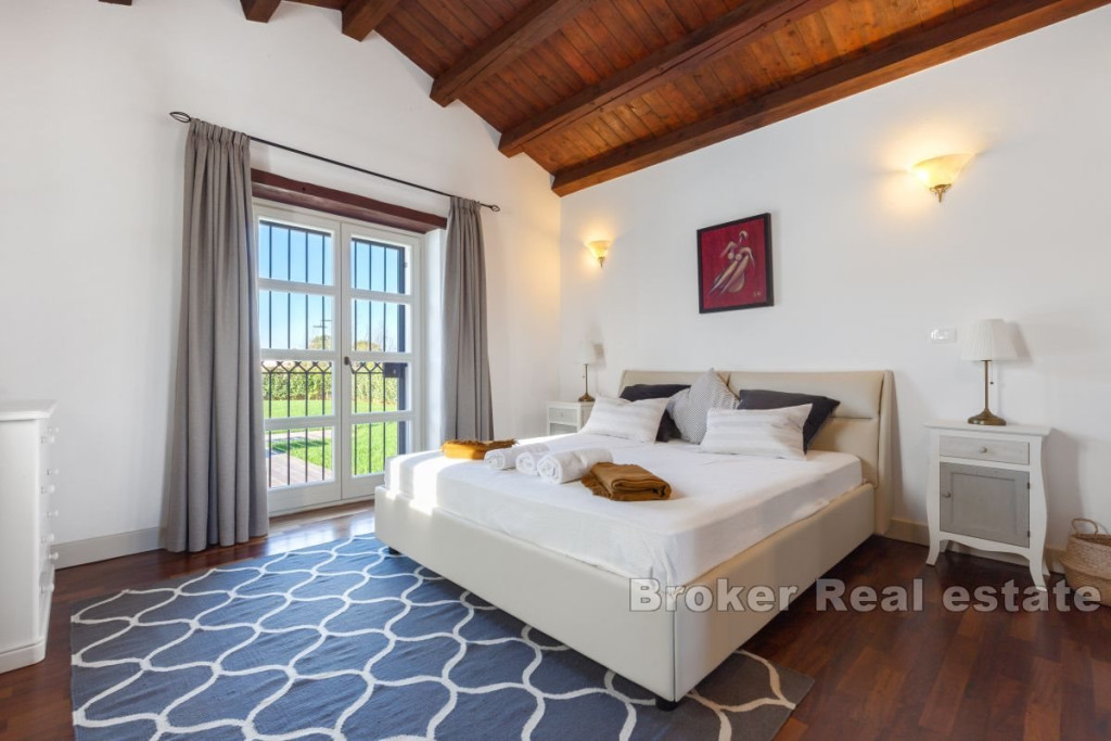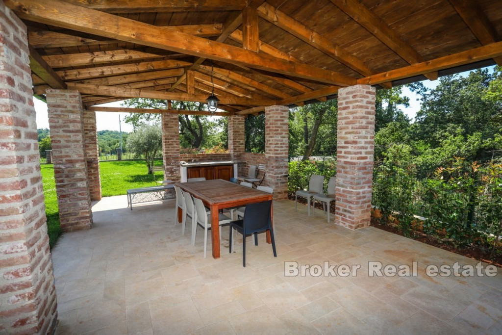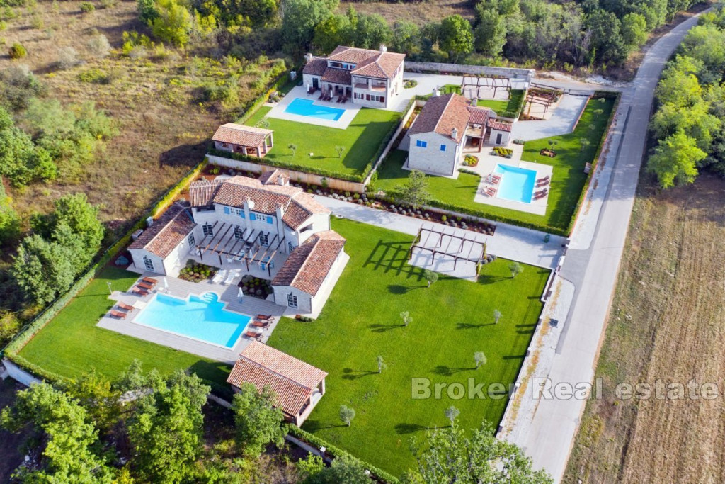 A beautiful stone villa for sale, located in the heart of Istria near Tinjan. This attractive villa offers an exceptional blend of traditional charm and modern luxury. Located on a spacious plot of 2347 m2, the villa has a total living area of 269 m2, elegantly distributed over two floors. The ground floor consists of an entrance hall, airy living room, kitchen, dining room, two comfortable bedrooms, each with its own bathroom and direct access to the terrace, pantry, boiler room and toilet. An internal staircase leads to the first floor, where there are two bedrooms, each with its own bathroom and a private loggia, offering a beautiful view and a peaceful atmosphere. The outdoor space consists of a beautifully landscaped garden, a sun-drenched pool with a sun deck and a summer kitchen with a grill ideal for entertaining outdoors. The entrance to the fenced yard is secured by sliding doors with remote opening, four parking spaces are provided for additional comfort. Built with the highest quality materials and fully furnished, this villa combines luxury with traditional Istrian architecture, offering a unique and inviting living experience. BROKER REFERENCE ID:1024/06