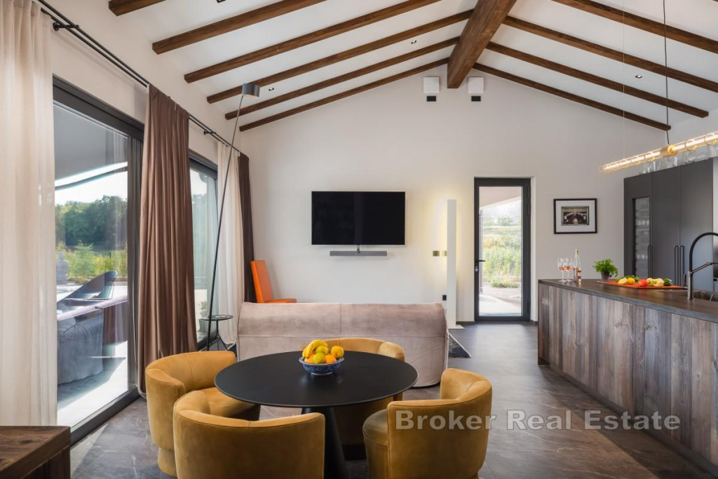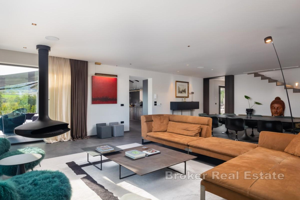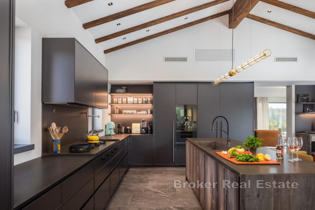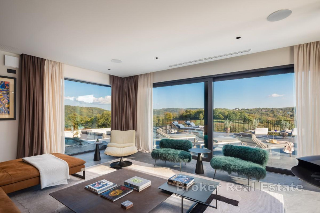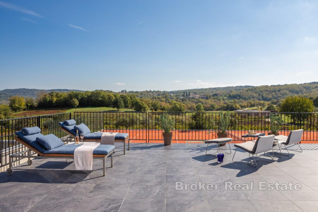 This exceptional luxury villa, positioned on the gentle hills of Motovun, represents a flawless fusion of traditional Istrian architecture and contemporary design. Set on a private estate of 2,700 m² with a living area of 435 m², the property provides an extraordinary sense of space, comfort and complete privacy. Every part of the villa offers an unobstructed panoramic view of Motovun and the surrounding Mediterranean landscape, creating an atmosphere of refined exclusivity. The interior is furnished with premium designer pieces such as Baxter, Paola Lenti and Laurameroni Design Collection, valued at 850,000 euros, reflecting remarkable attention to detail and an uncompromising approach to luxury. The purchase can be arranged either fully furnished or unfurnished, depending on the buyer’s preference. This flexibility allows the future owner to choose between a turnkey move-in experience or full freedom to personalise the interior according to their own vision. The expansive living room with a modern fireplace is seamlessly connected to the elegant dining area and the fully equipped Gaggenau kitchen. The same level includes a beautifully designed bedroom with an ensuite bathroom and a fully equipped fitness room with floor-to-ceiling mirrors. Additional rooms such as the laundry and storage area enhance the practicality and convenience of daily living. The upper floor contains two luxurious bedrooms with ensuite bathrooms, while the master suite provides complete privacy and comfort with a walk-in wardrobe and a freestanding bathtub positioned to offer the perfect view of the Istrian landscape. The lower level, accessible from both inside and outside, features a spa area with a sauna and a directly connected bathroom. The outdoor area is equally impressive, featuring a private tennis court built to ATP standards, an infinity pool that visually blends into the landscape, a jacuzzi, a spacious covered summer kitchen and elegant lounge zones. The villa holds an A+ A+ energy certificate, the highest possible category of energy efficiency, confirming exceptional construction quality, superior insulation and the most advanced heating and cooling systems. Designed and built without compromise, it represents an ideal property for buyers seeking exclusivity, privacy and impeccable quality. BROKER REFERENCE ID:2053/27