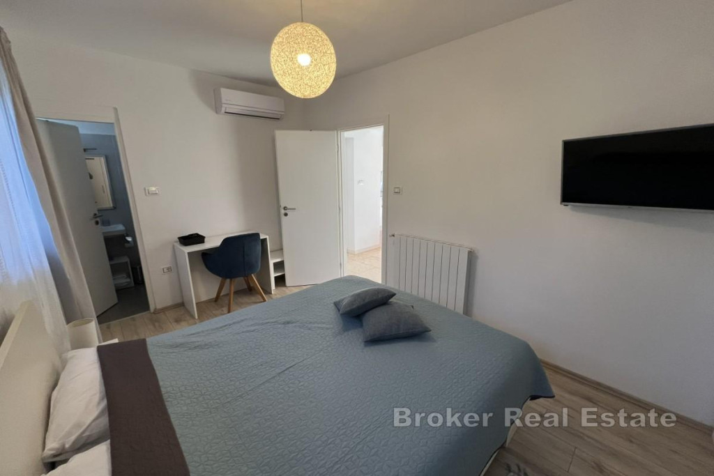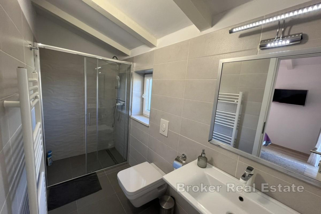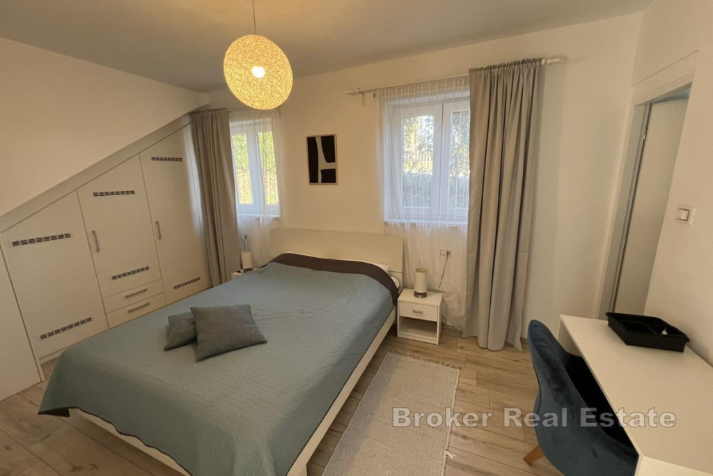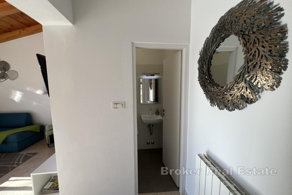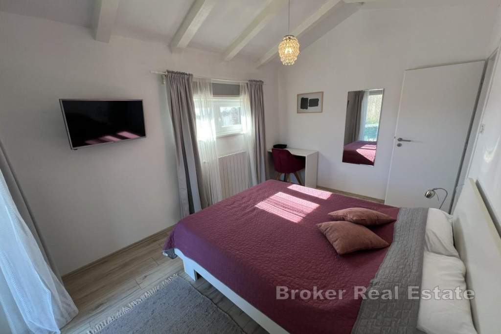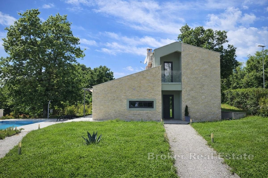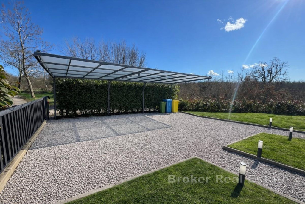 Nestled in the peaceful green surroundings of Zabrežani, Istria, this detached luxury villa offers approx. 85 m² of thoughtfully designed living space over two levels, ideal for family stays or premium rental. The ground floor features a fully equipped kitchen with dining area and a spacious living room with air conditioning and a fireplace, opening directly onto the covered terrace and private swimming pool (6 × 4 m). On the same level, there is a comfortable bedroom with double bed, air conditioning, TV and en-suite shower, plus a separate guest WC, combining daily living with convenience. Upstairs, the elegant second bedroom offers a double bed, air conditioning, TV and access to a balcony, along with its own bathroom with shower. Both levels are air-conditioned, and the interior exudes comfort and refined style. Located on a fully fenced plot of 780 m², the property includes a private pool, a generous garden with seating and barbecue area, and space for two cars. The setting ensures a tranquil retreat surrounded by nature, while the coastal towns of Poreč, Rovinj and Pula are reachable within about an hour’s drive. The nearest shop and restaurant are approximately 2.7 km away. Distance to Pazin is 10 km. BROKER REFERENCE ID:2053/40
