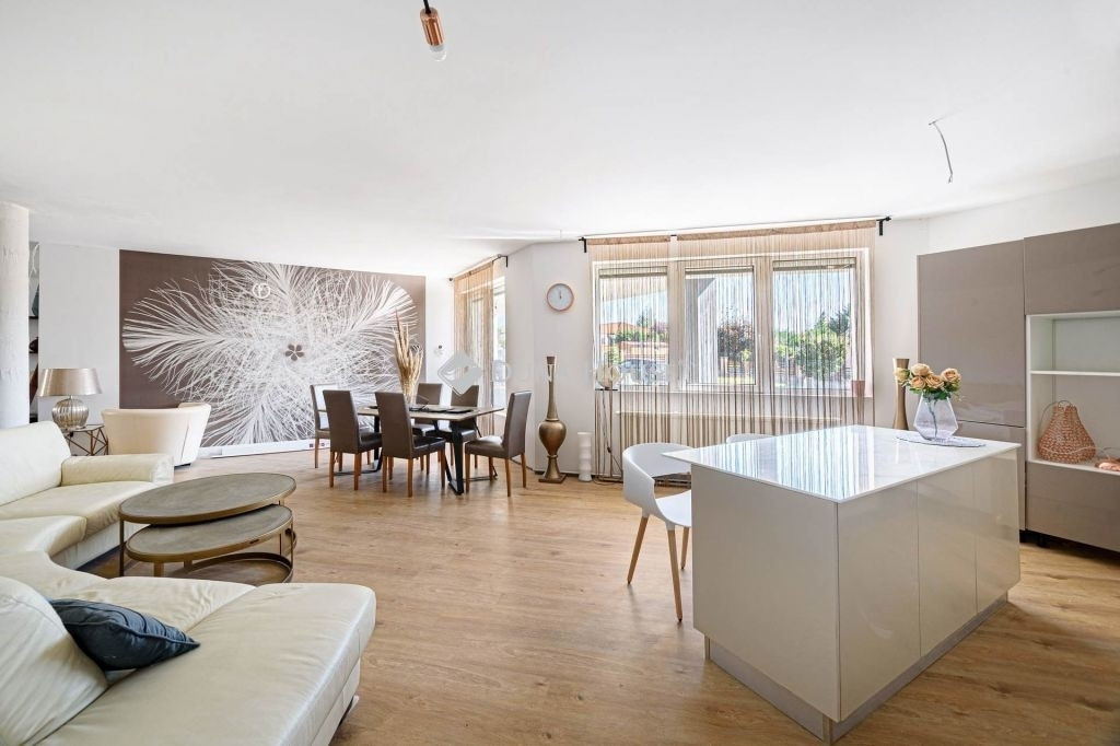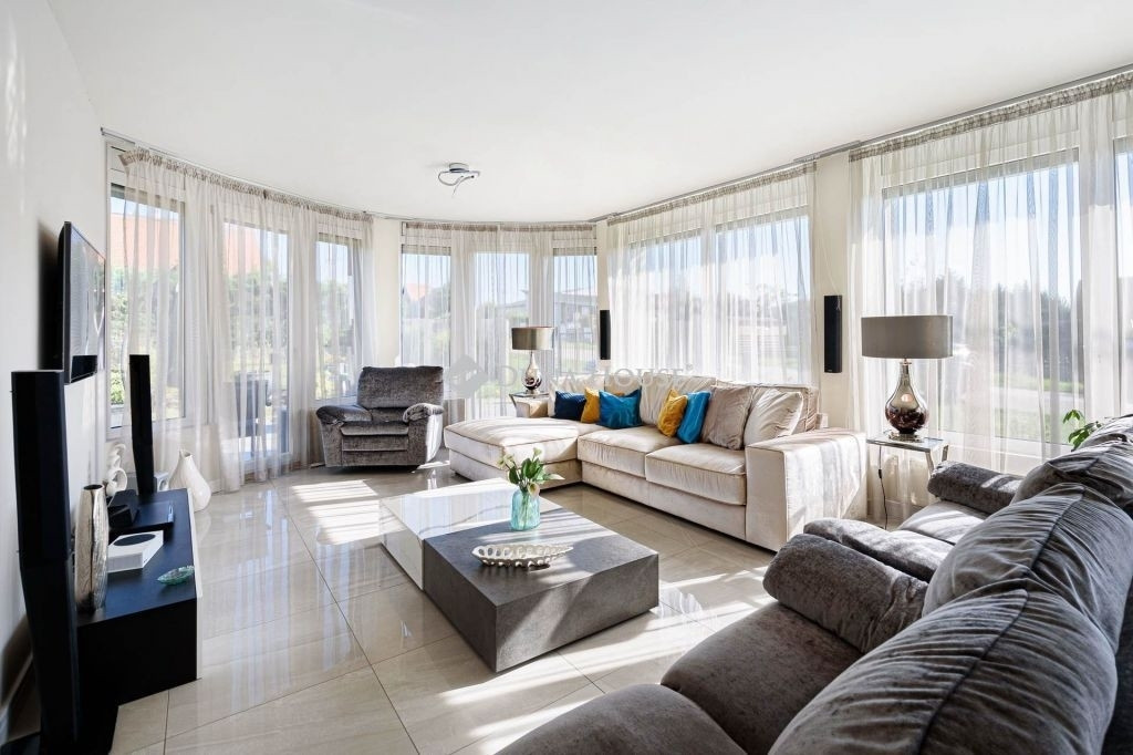 A másik lakásban a nappali mellett fűtött, dupla, két autó beállására alkalmas, motoros távműködtetésű ajtóval zárt garázs és 300 nm-es telekterület, összesen 48 nm terasz tartozik. A földszinten vagy az előszobából, vagy közvetlenül a garázsból a 58nm –es nappali-konyha-étkezőbe jutunk, amihez kapcsolódik a közös terasz és egy szülői háló. Jobbra nyílik egy fürdőszoba, mellette egy spájz. A széles lépcsőházban feljutva egy újabb nappali található, ebből nyílik 3 szoba, egy fürdőszoba, egy külön WC és a mosókonyha. Mindegyik szobához tartozik terasz gyönyörű panorámával.
