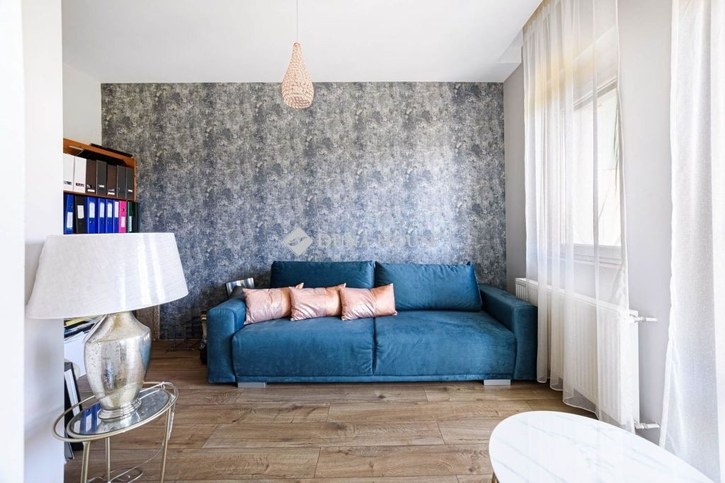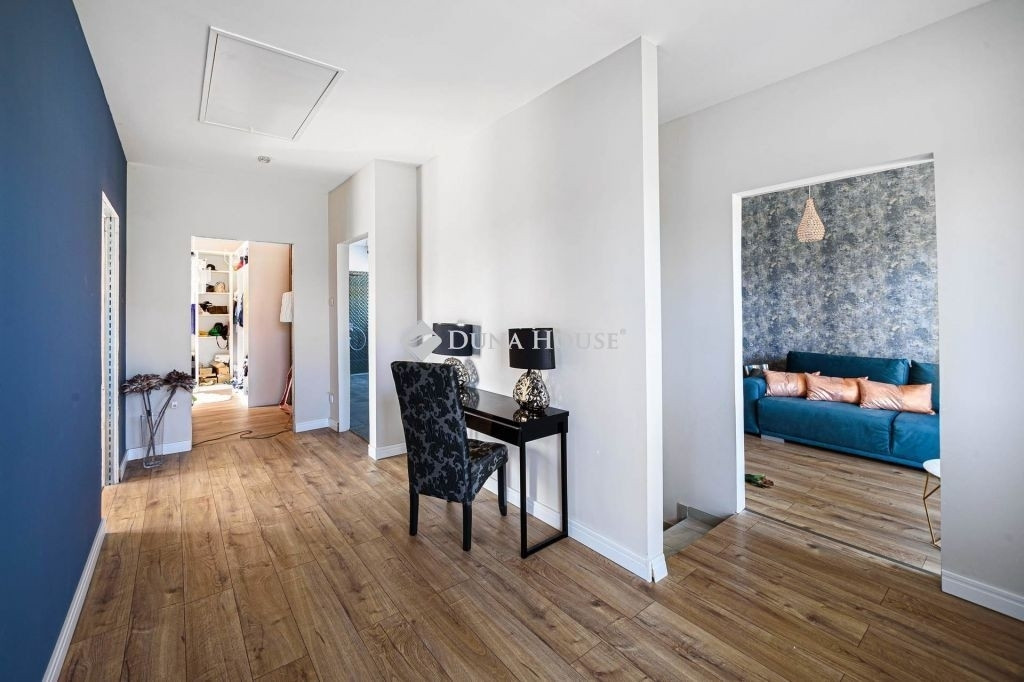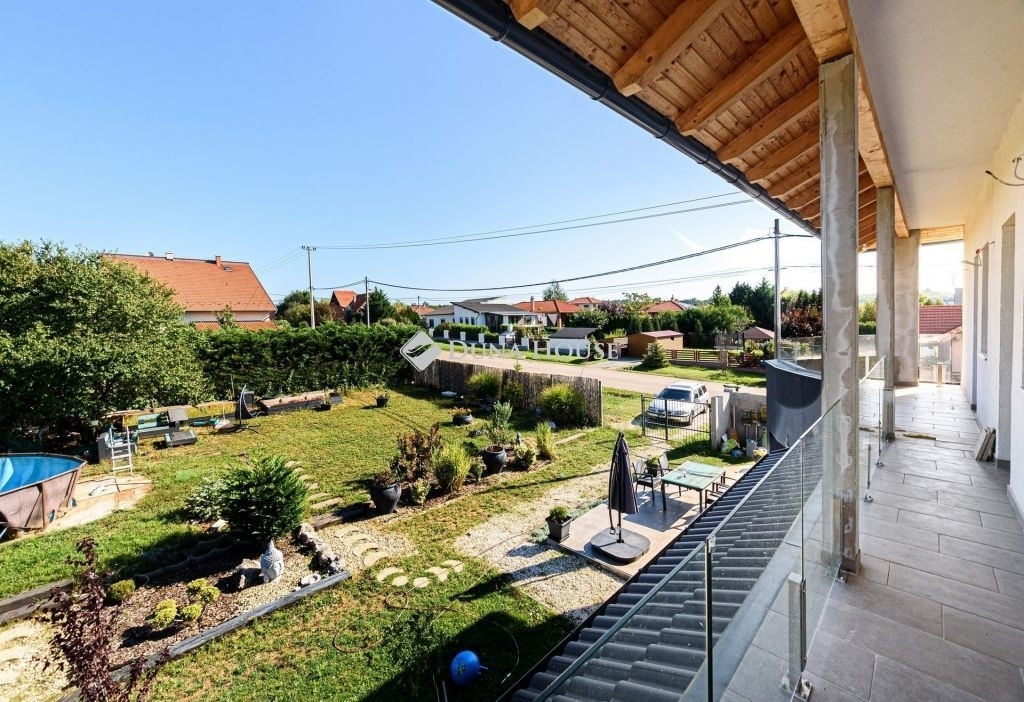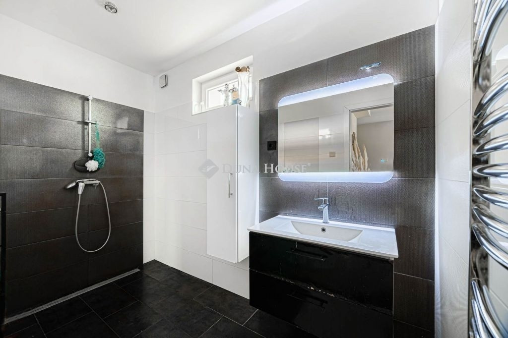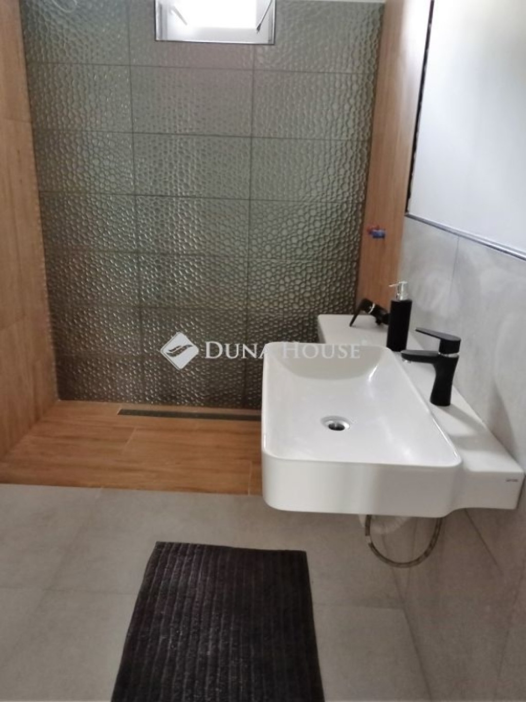A nagyobbik lakás nappalijában és a közlekedőkben járólap, a szobákban nagy kopásállóságú laminált burkolat. A fűtést és a melegvizet gázkazán biztosítja. A nappaliban padlófűtés, a további helyiségekben radiátorok vannak. Kamera és riasztórendszer. 30 cm-es külső falvastagság és 15 cm-es szigetelés. Ehhez a házrészhez 836 nm-es telekterület tartozik, és összességében 65 nm-es terasz, nappali –konyha és étkező közel 70 nm-es, központi porszívó és központi szennyes ledobó van.