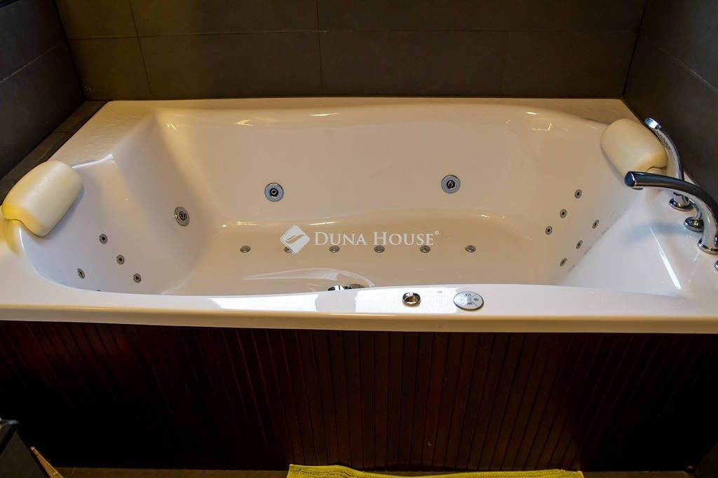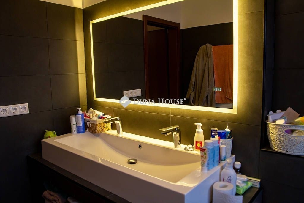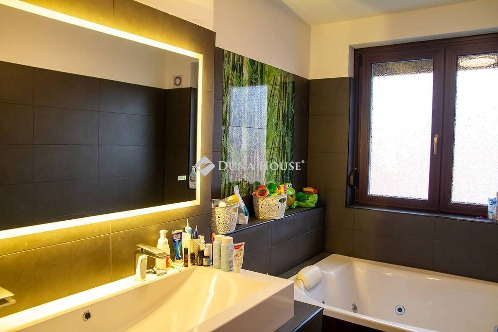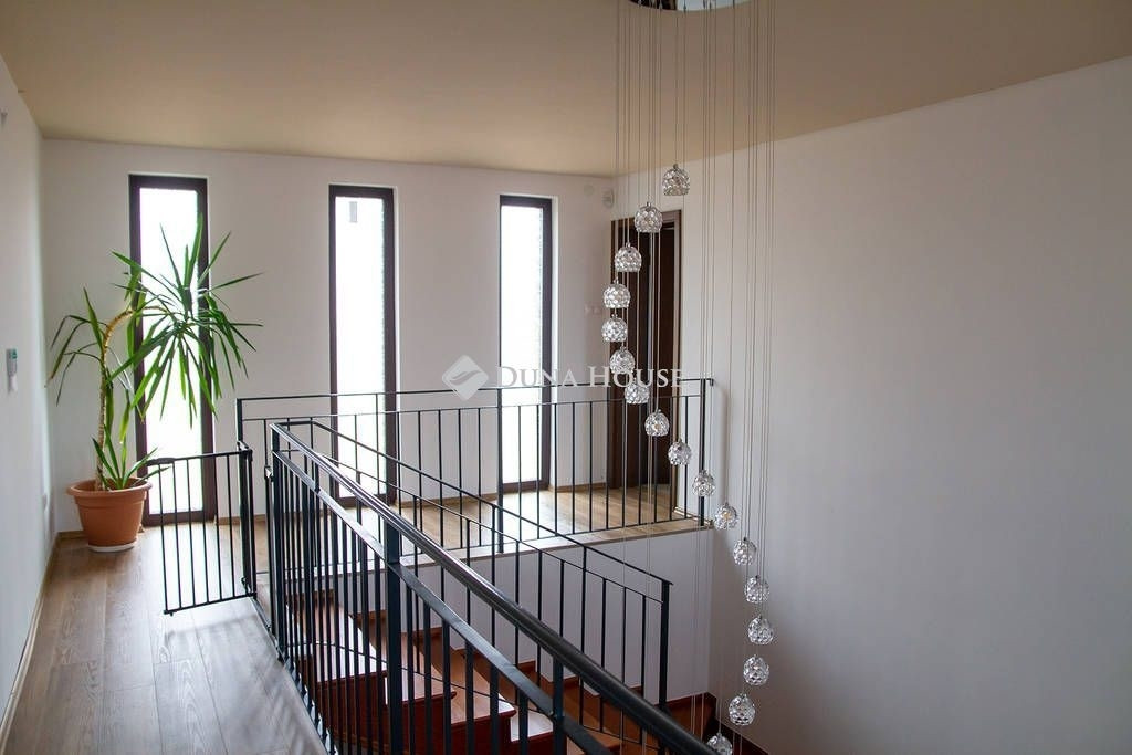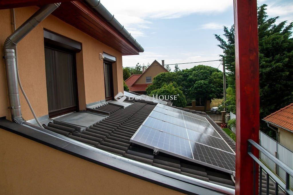 A biztonságot riasztó és kamera rendszer, támogatja. A házban modern DAIKIN mennyezet hűtés-fűtés biztosítja télen a meleget, nyáron a hideget. Miért jó ez a rendszer? A mennyezetben és a padlóban 2km hosszú csőben vizet keringet a rendszer amit a nagy hő leadó felület miatt nem kell nagyon magas hőfokra fűteni/hűteni. Így a rendszer gazdaságosabban tudja melegen/hidegen tartani az egész házat, minden szobában külön termosztáttal vezérelhető, hol/milyen hőfokra hűtsön/fűtsön. A fűtésnél azért jó, mert kellemes kiegyenlített meleget tud csinálni a padló és a mennyezeten keresztül, nyáron pedig olyan pincehideg tehát nem az arcunkba fúj a rendszer, hanem a mennyezetből(úgy van beállítva, hogy a padlót nem hűt) jön a hideg, így kellemes. A ház teljesen elektromos árammal működik, amelyet a tetőn elhelyezett 46 db napelem szinte teljesen költség mentessé tesz. Mindegyik ablak felső kategóriás 3 rétegű üvegezéssel, kívül belül anyagában is mahagóni barna színt kapott. Az árnyékolásról alumínium redőnyök gondoskodnak, amelyeknek egy része elektromosan működő, időzíthető, távirányítóval vezérelhető. Padlástérben különleges pezocell szigetelés van, amely 30 cm vastagságban védi a házat. A szigetelés felett 50 nm fából kialakított pakolható padlástér található.